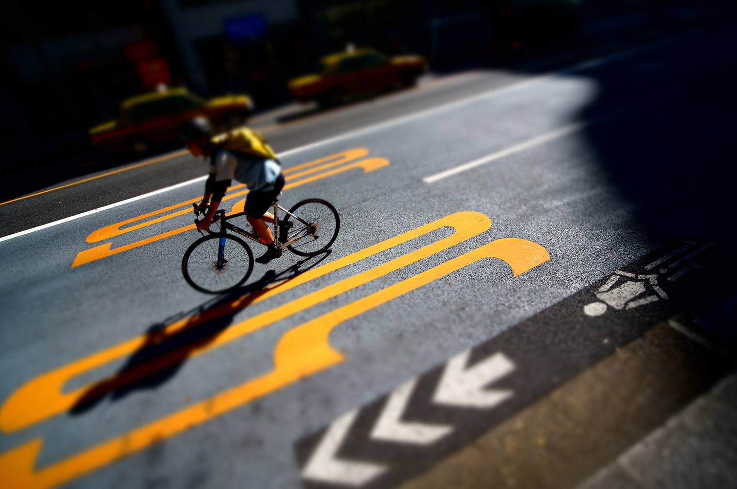 ここまでの色の組み合わせを気にしているわけではなかったのだが、すべての黄色が偶然そろった。色を気にして撮る事はもちろん多いのだが、この時は、この50と50の間を自転車が駆け抜けたらかっこいい写真になるかなと思っていた。そこに自転車が来たのでシャッターを切ろうとした時、あ、リュックも黄色である事に気づいた。ラッキーだなと思って、写真を見返すと更に二台のタクシーも黄色で嬉しかった。