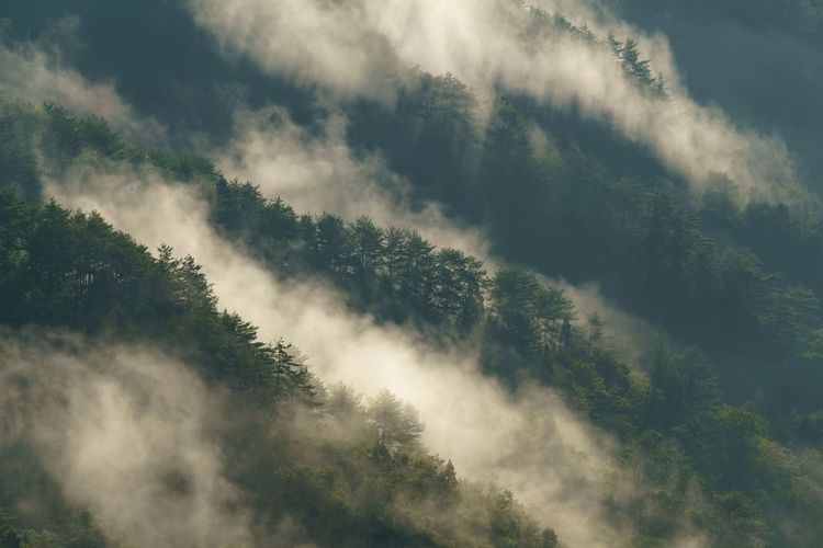 前述の平野部での条件を満たせば、より深い霧となりますが、それ以外でも雨が降る、もしくは雨上がりなどは山の斜面に雲がかかるように霧が発生します。湧き上がるような霧となることもあります。実は雲と霧は同じもので、浮かんでいるものが雲。接地しているものが霧と定義されています。下から見上げていると山の頂上付近にかかっているのが雲に見えますが、実際にその付近を歩いている人にとっては霧だということですね。こちらのタイプは季節関係なく発生します。