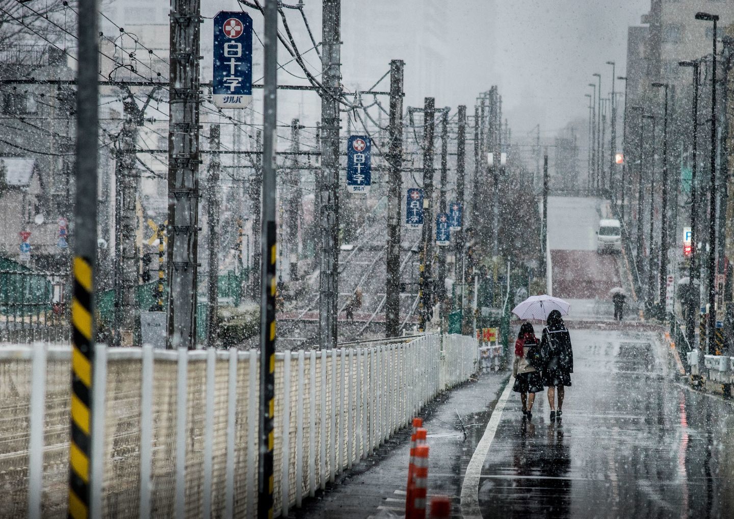 数年前の大雪の日、家から電車に乗り継いで一時間ぐらい掛かるこの場所へ迷わず向かった。真っすぐな道がほんの少し谷になっているので、望遠で丘の方から撮ると雪がただ降っているのではなく、レンズを向けた方向に暗い場所の面積が増える。それにより雪の粒が目立つのと、遠方の陰影もよく見える。線路を渡る傘の人を待っていたのだが、もうこの場面は細かいことを言わなくてもわかる印象的な写真になっていると思う。