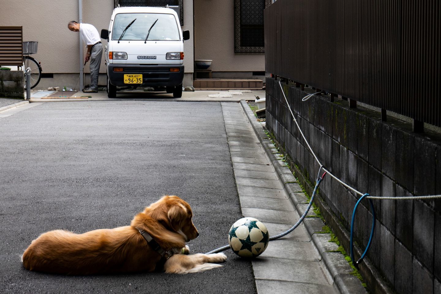 犬がボールとにらめっこしている場面に出くわした。その先で男性がゴルフの練習。「ボール遊び繋がり」って頭に浮かんだ。しかし、ここでいきなり男性の方にレンズを向けると練習をやめてしまう可能性があるので、なるべく犬を狙っている風を装い、男性の姿勢を一番気にしつつシャッターを切った。この場面で他に気を付けた事は、右側の自転車のカギ(青い輪っか)と軽自動車を構図の中に入れた事だ。これだ!と思った場面でも、更に細かいところを見て撮ることが写真の奥深さになっていくと思う。