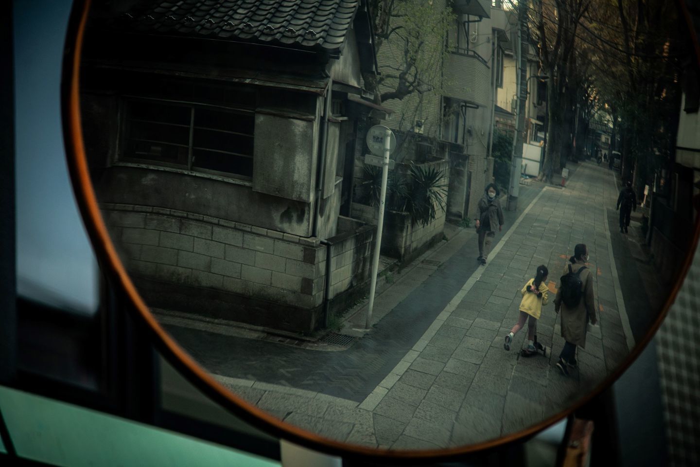 角にある古民家は味があるのでよく撮影するのだが、行きかう人も一緒に撮りたいので、カーブミラーに映りこんでいるところを望遠で狙った一枚。このご時世、街中では人にレンズを向けづらいのでこんな撮り方をしてみるものいいかもしれない。角度的に参道の奥まで写るように、高い位置にカメラを持って撮っている。あとはこんな中でも人の動き、間隔も見てシャッターを切ることが大事だ。