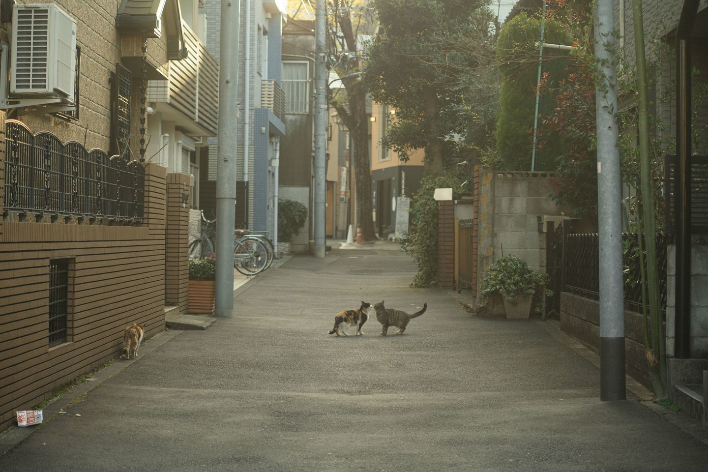 この辺りの野良猫は餌を沢山もらっているのか、喧嘩もしないのでのんびりとした光景を撮ることができる。望遠を付けていても寄り過ぎず、街の雰囲気を残しつつ撮ることを心掛けている。左側の猫がさみしく端っこを歩いているところがお気に入り。猫だけを注視した写真にならないよう気を付けた。