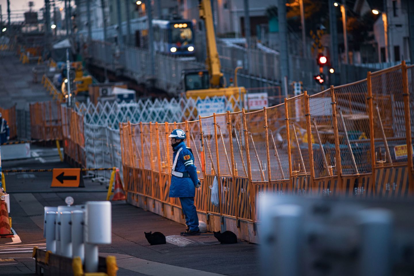 街を歩いていると、なにこれって不思議な場面に出くわすことがあると思うが、これはほとんどの人には一生に一回も出会わなさそうな場面。警備の男性を囲む子猫が3匹。男性は落ち着いていてしばらく動かなそうだったので、電車を待ってパチリ。電車も含めたお気に入りの写真になってくれた。こんな凄い状況でもメインの被写体が動かないと思った場合は、他に動くものを少し待つ。プラス1を意識するだけでも作品性がぐっと上がる。