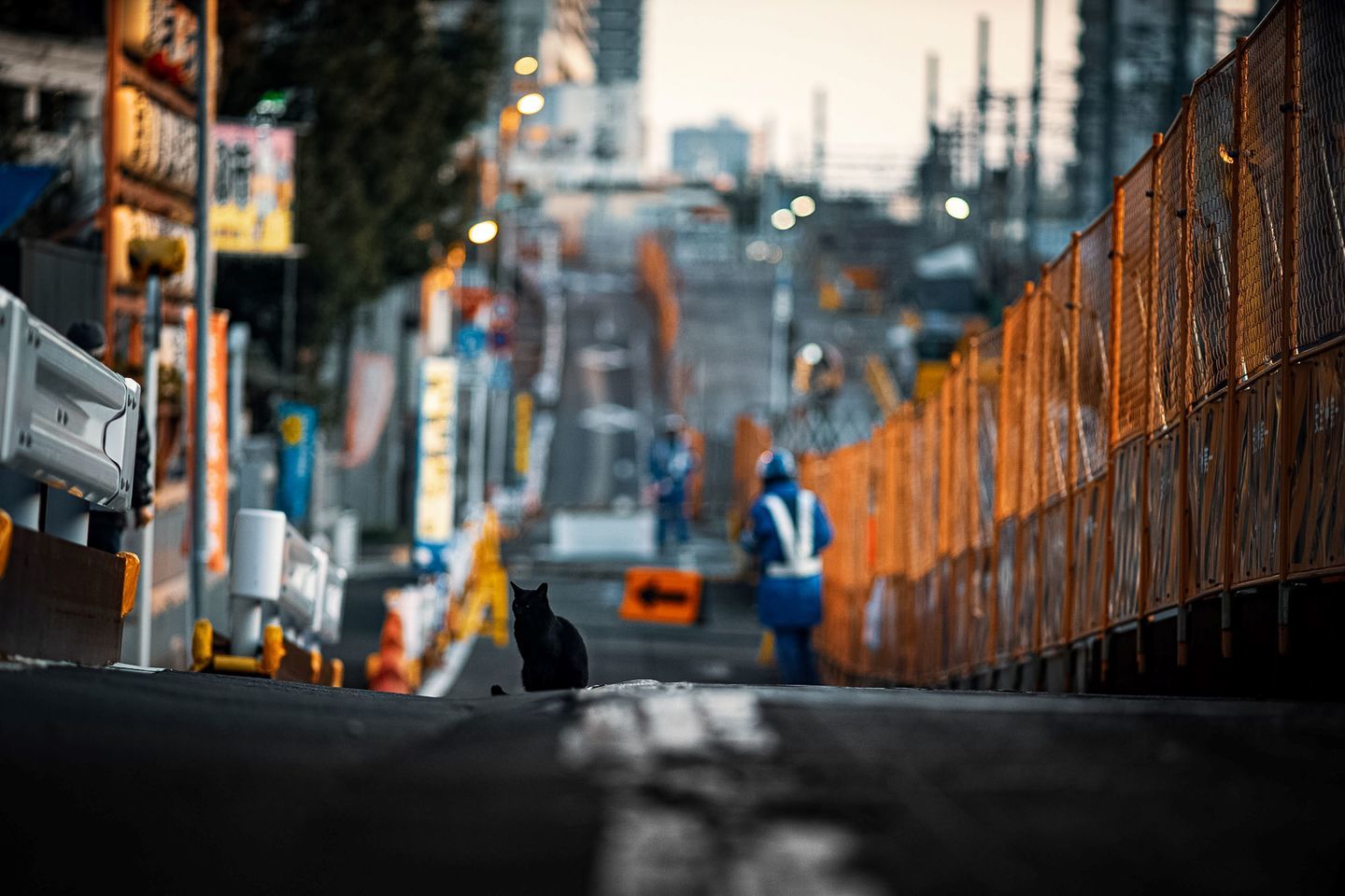 街スナップでは機材が一気に重たくなってしまうので、大きく明るい望遠を使うことは少ないと思うがこんな風に見通しがよくなる場所があるとわかっているときは、持っていくと印象的な写真が撮れることが多い。情報量も一気に多くなるし、ボケも生かしやすくなる。この場面では黒猫だったのが幸い。完全にシルエットとなり、表情もわからないが、猫の右上の矢印がポイントとなったお気に入りの一枚。