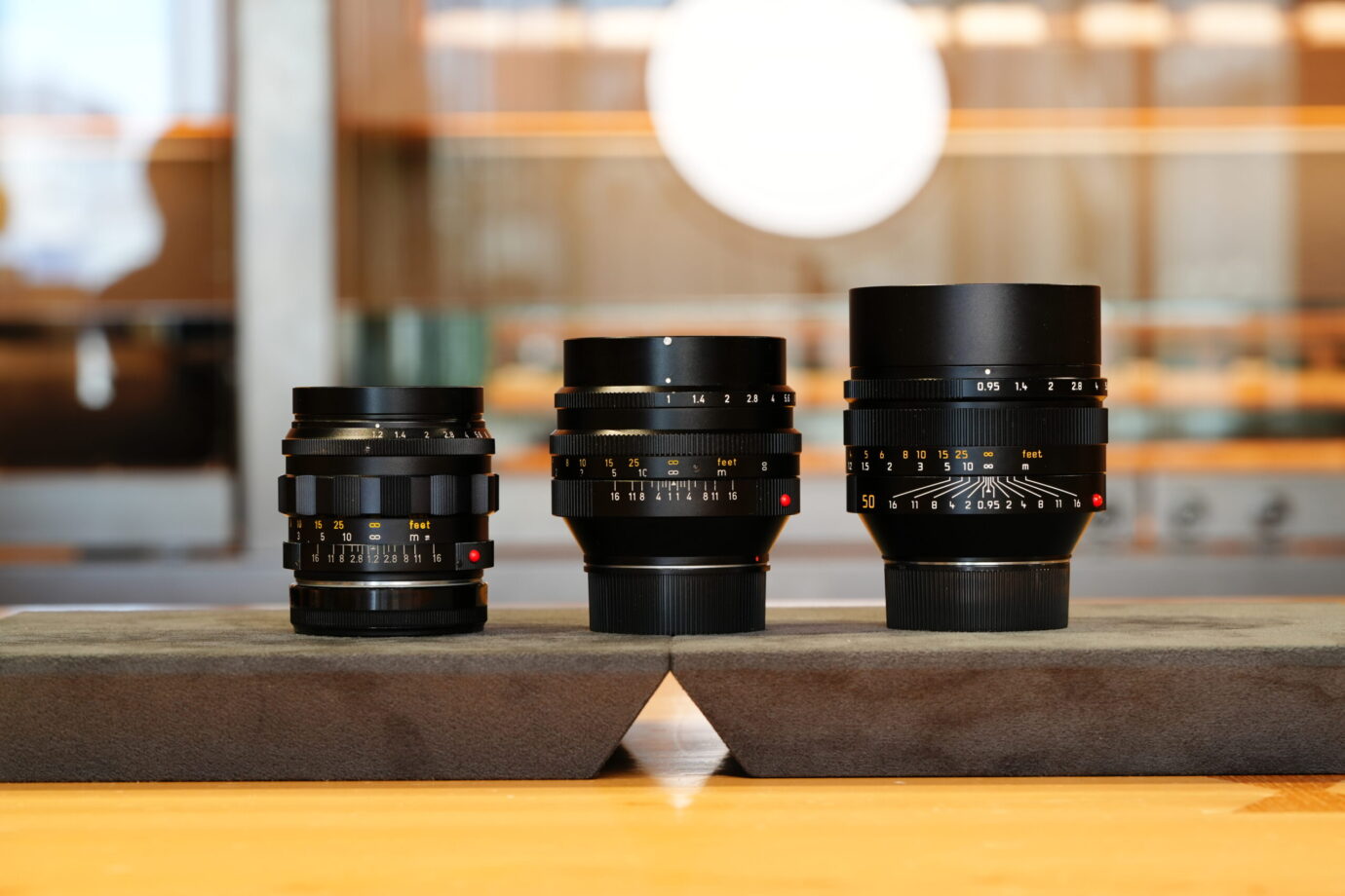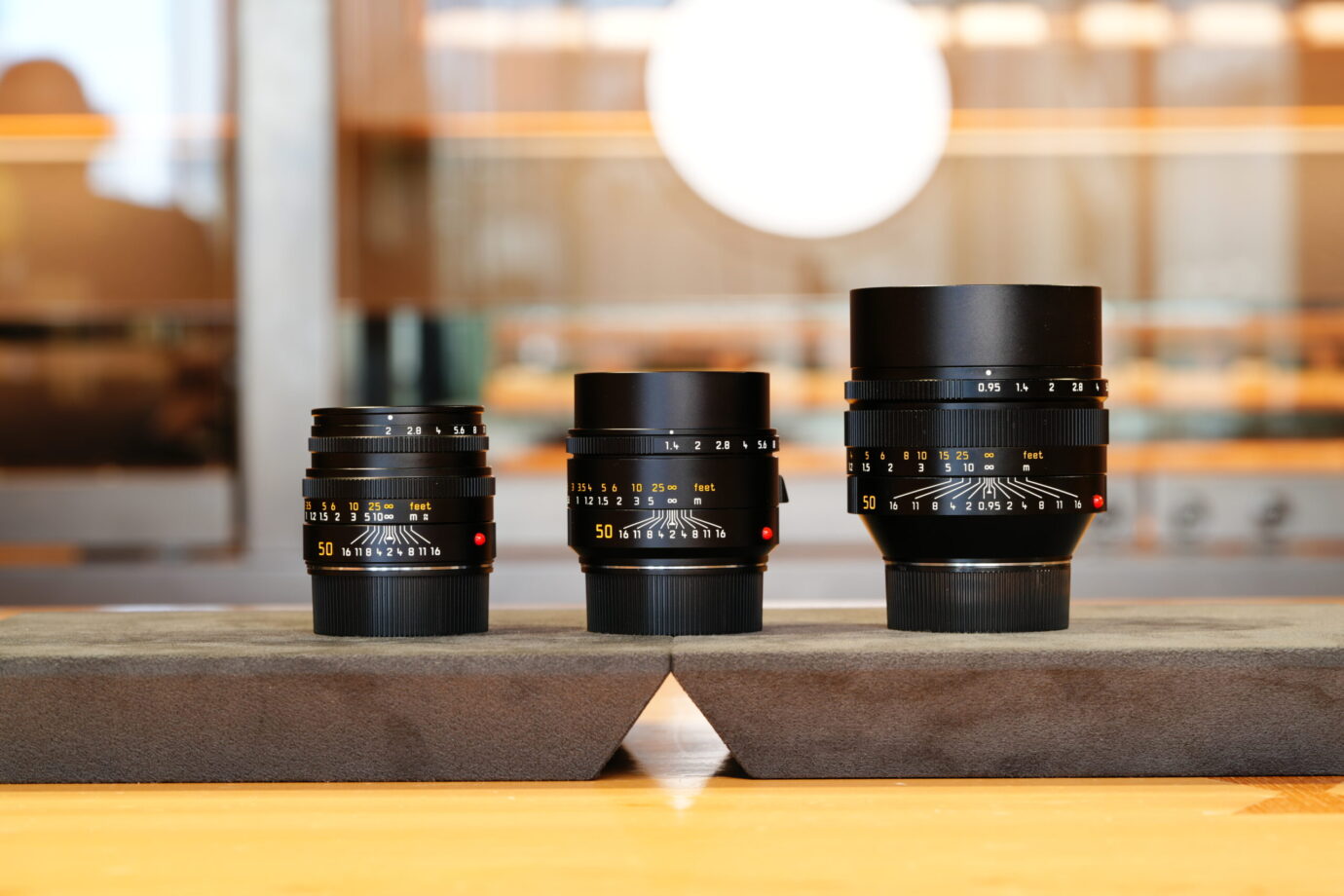 左:球面のズミクロンF2、中:非球面のズミルックスF1.4、右:現行のF0.95です。こうして並べてみるとズミクロンF2はコンパクトですよね〜。開放F値が向上するのに伴って、レンズのサイズ感も右肩上がりに上昇しています。この3本の標準レンズ、絞り開放で撮ってみるとどのような描写になるのか比較してみることにしましょう。