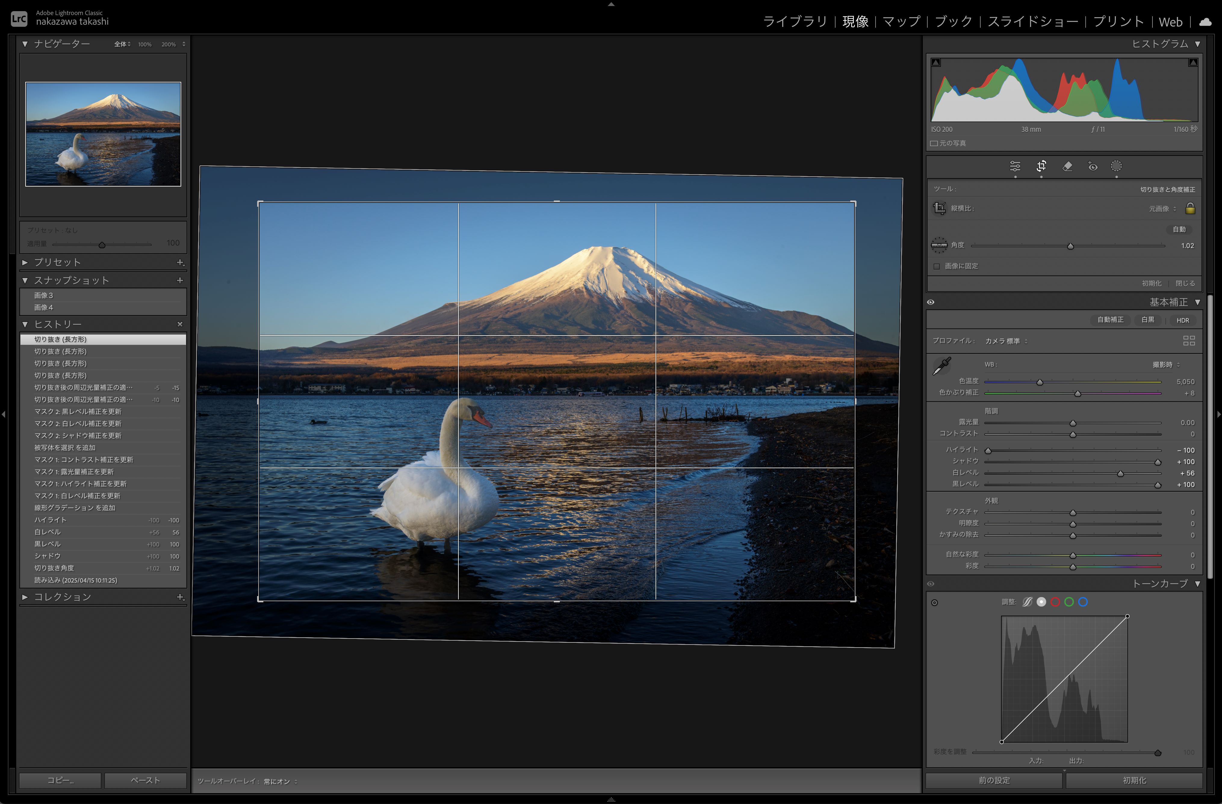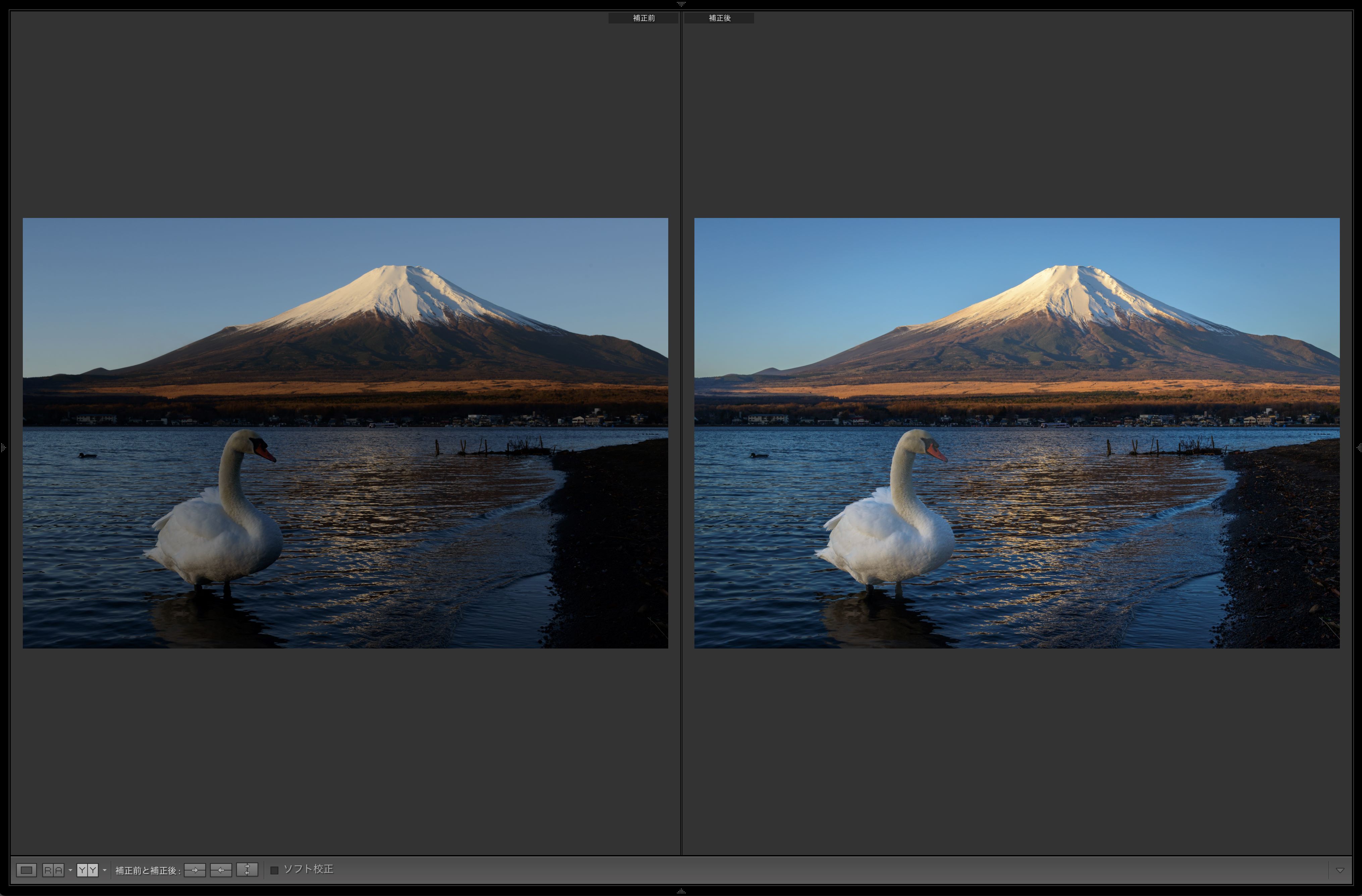 美しい富士山の冠雪と凛とした白鳥の立ち姿の両方を際立たせたいシーンですが、そのためには現像処理が必要となります。