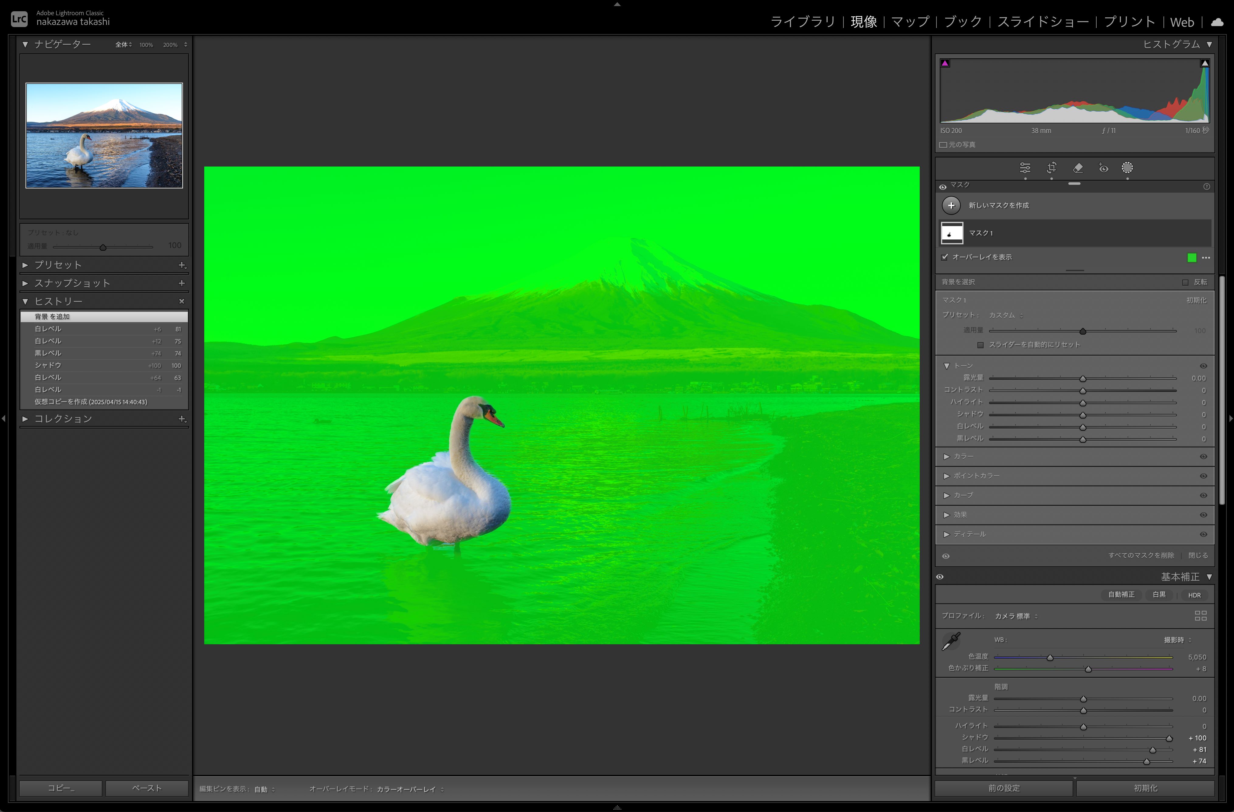 ここまで来たら、コンセプトを思い出して、富士山の冠雪と凛と佇む白鳥が最も際立つように最終処理を実施します。