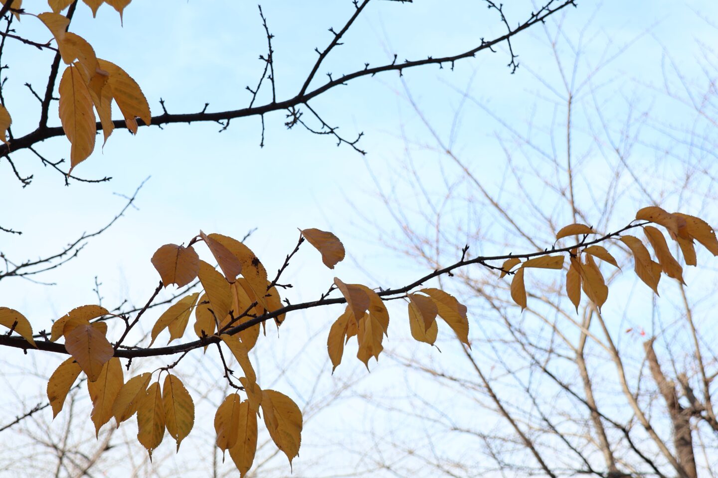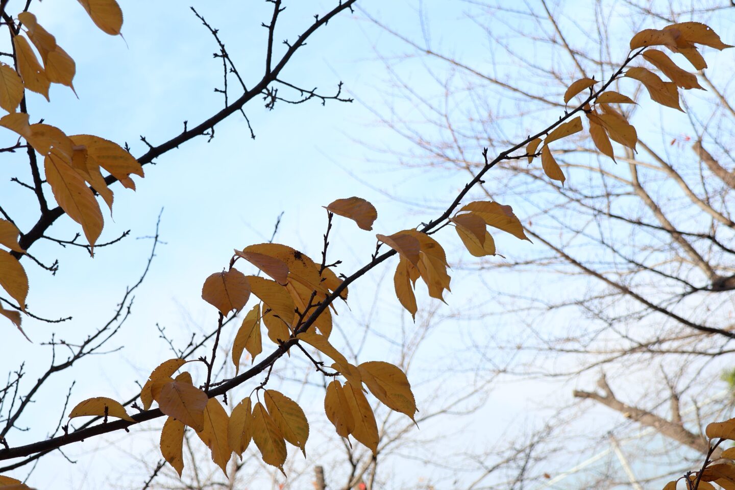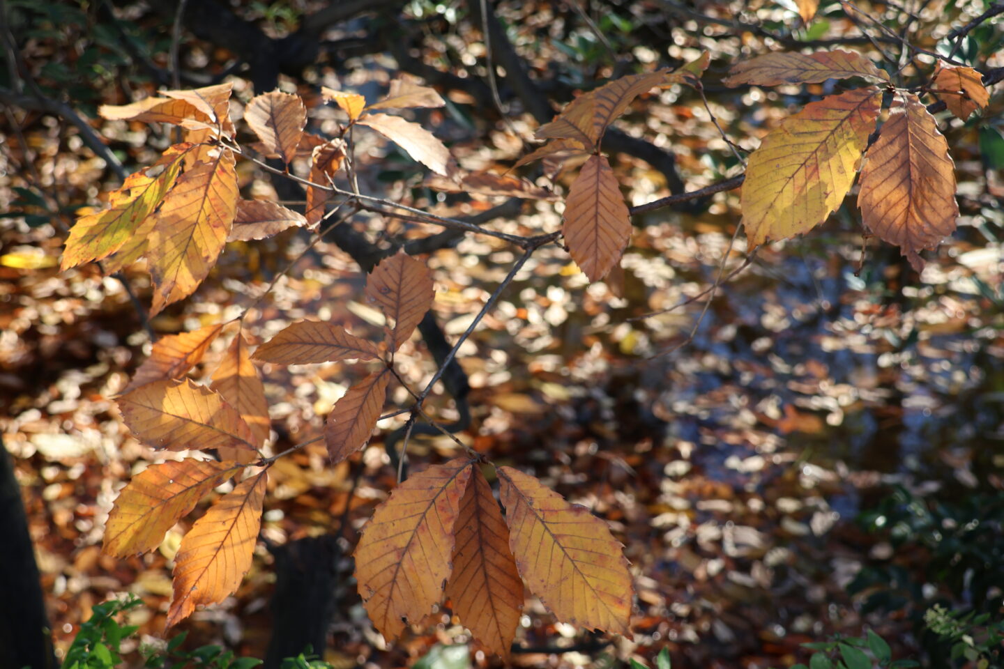 ローポジション・水平アングルで撮った落ち葉。地面すれすれの位置から撮ったことで、前後にボケができて一面に枯れ葉が落ちている雰囲気が出ました。