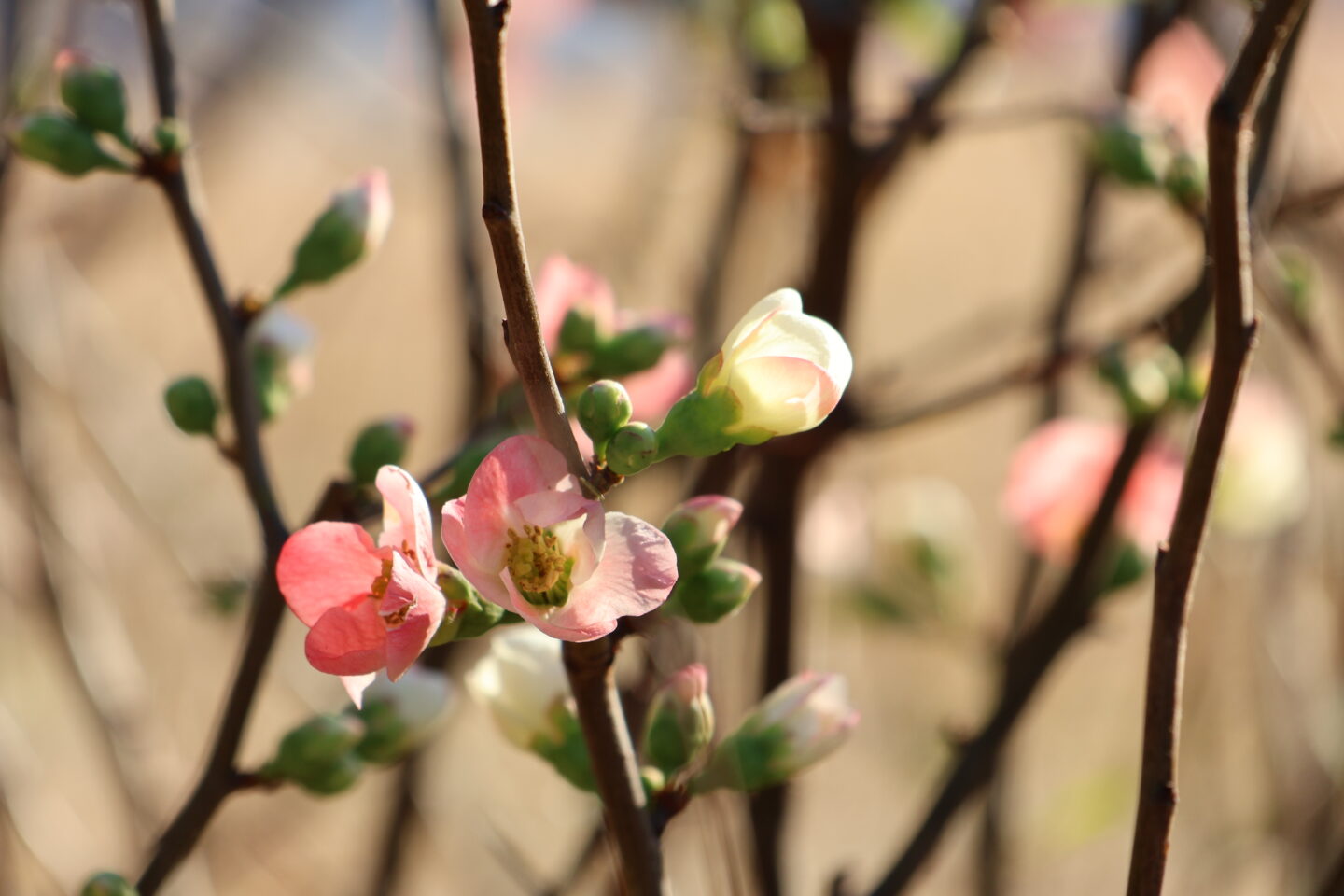 かわいらしい花が咲き始めていたのでアイポジションで撮影してみました。しかし、背景の枝ぶりが少し雑多な感じ…?