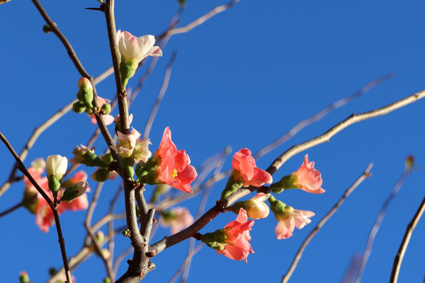ローポジション、ローアングルから撮ったことで冬の青空が背景となり、すっきりと爽やかなイメージになりました。同じ場所にある花を撮ってもこんなにイメージが変わるのですね。