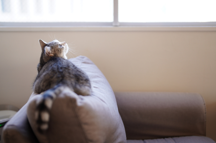 明るい窓際でくつろぐ所を背後からこっそり撮影し自然な姿を狙う。(撮影場所:ネコカフェMONTA)