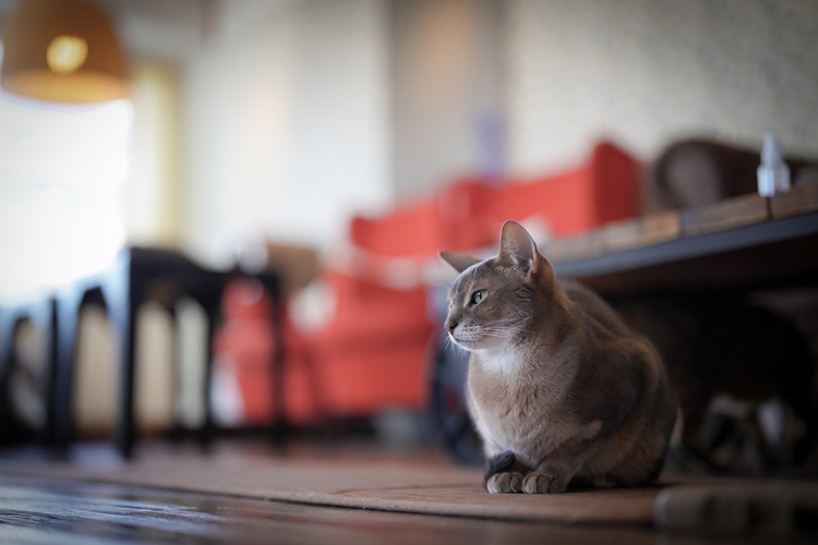 こちらは50mm単焦点レンズで撮影。美しいぼけ味によって猫が引き立ちました。(撮影場所:ネコカフェMONTA)
