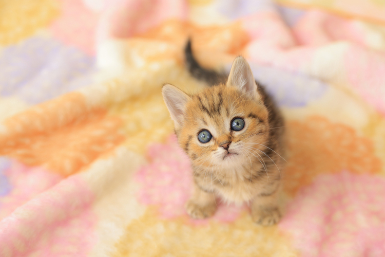 毛布を床に敷いて俯瞰から撮影した1枚。カメラ目線になるように猫じゃらしで誘導しています。