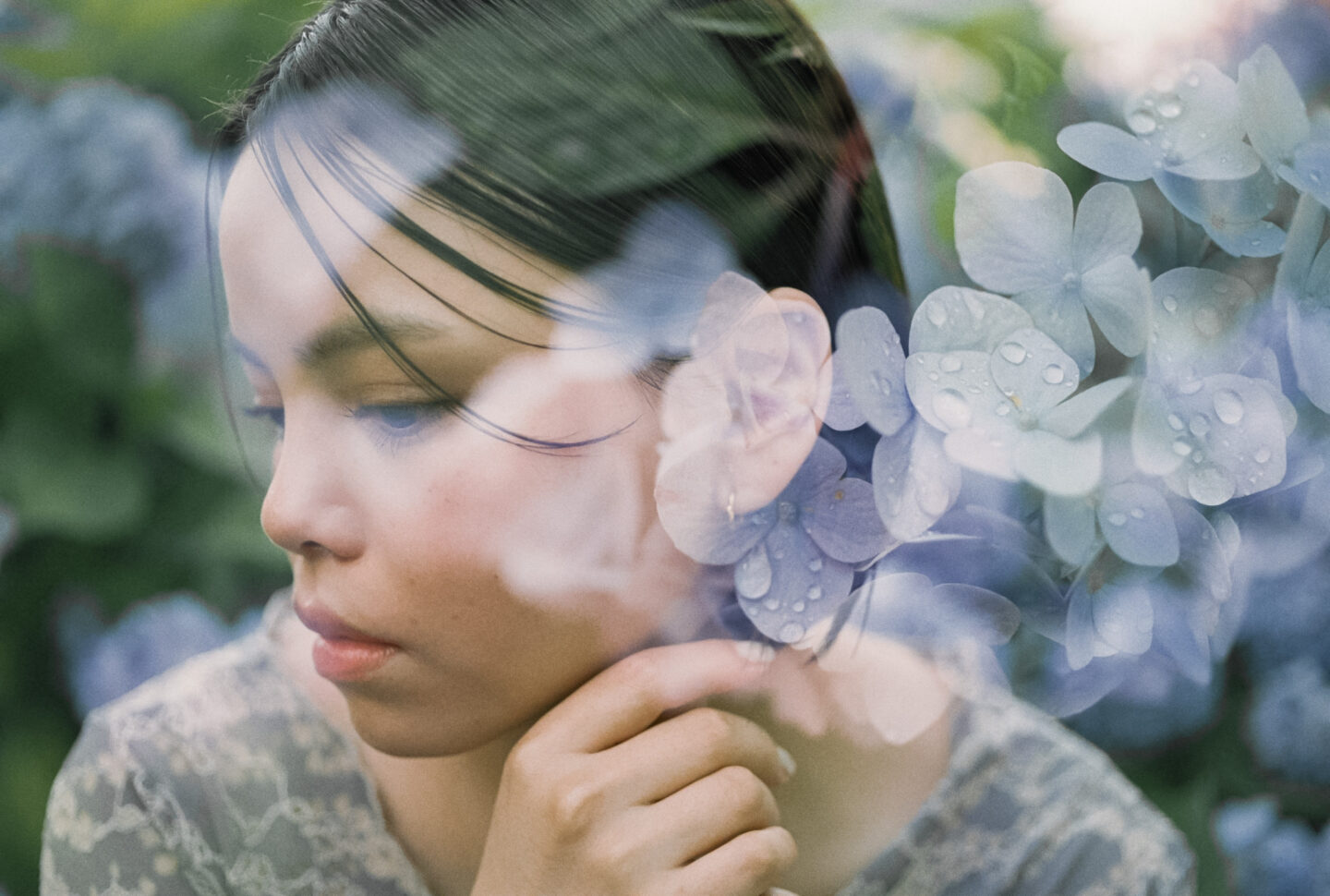 横顔に少しかかる様に水滴のついた紫陽花と。しっとりした雰囲気に仕上がりました。