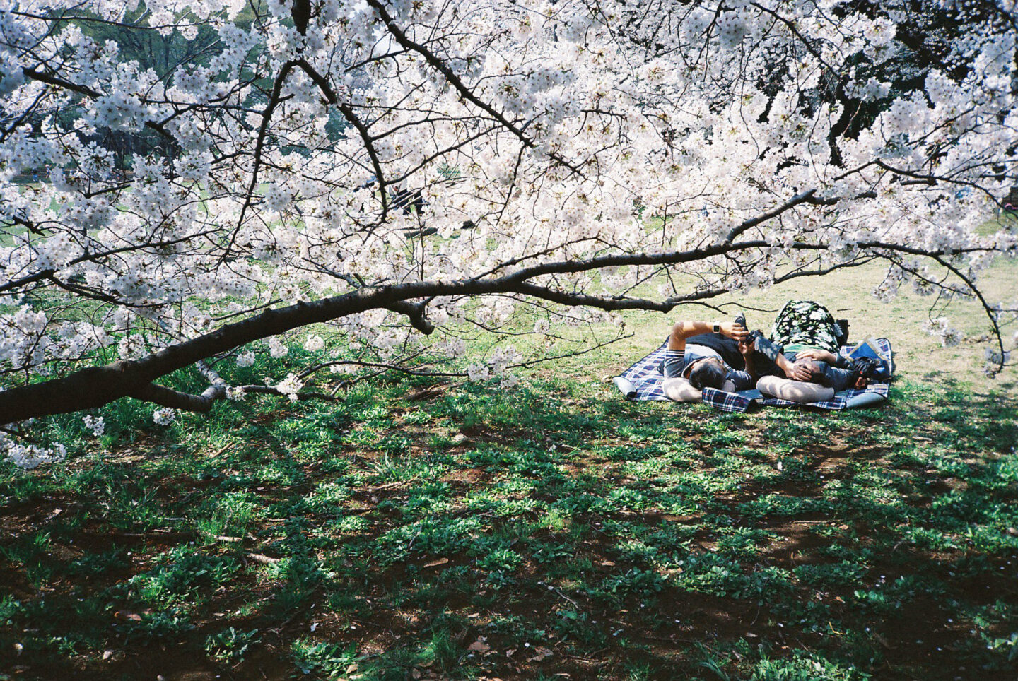 桜の幹の線をフレームのように捉え、くつろいでいる二人が囲まれているように撮影してみました。