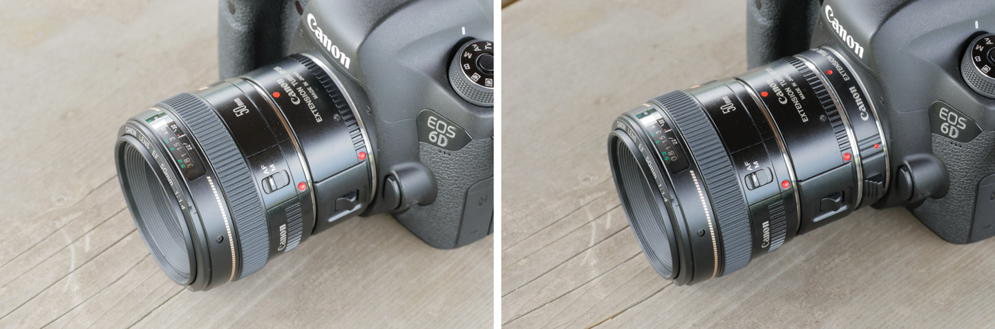 接写リングには厚みの違うものが用意され、12mm、20mm、36mmなどがセットになったものもあります。厚みのある方が近づいて撮影できるようになりますが、撮影するレンズの焦点距離によって適切な厚みがあります。広角レンズと組み合わせるとごく薄いものでかなり近づけるようになり、望遠レンズでは厚みのあるものが必要になります。ズームレンズにつけた場合、同じ厚みの接写リングでは広角側の方が近づいて撮れることになりますが、被写体に近づきすぎて扱いにくいこともありますので、利用しやすい範囲で使うようにしましょう。