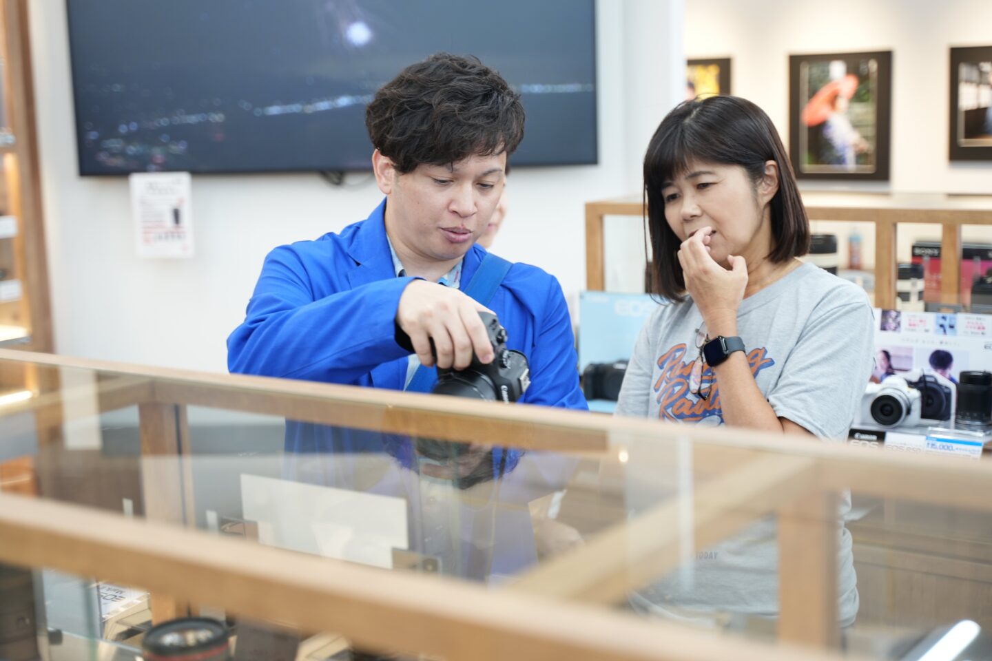 また、店内の体験コーナーを活用し、最新機材に触れながら撮影方法を学習。榮留さんに設定を直接教わったり、参加者同士で教え合ったりと和やかな雰囲気が広がりました。並柳店のスタッフに高価な望遠レンズを用意していただき「思ったより軽い」「使ってみたかった」と驚く声も上がり、機材に触れる喜びが座学を実践力へとつなげました。