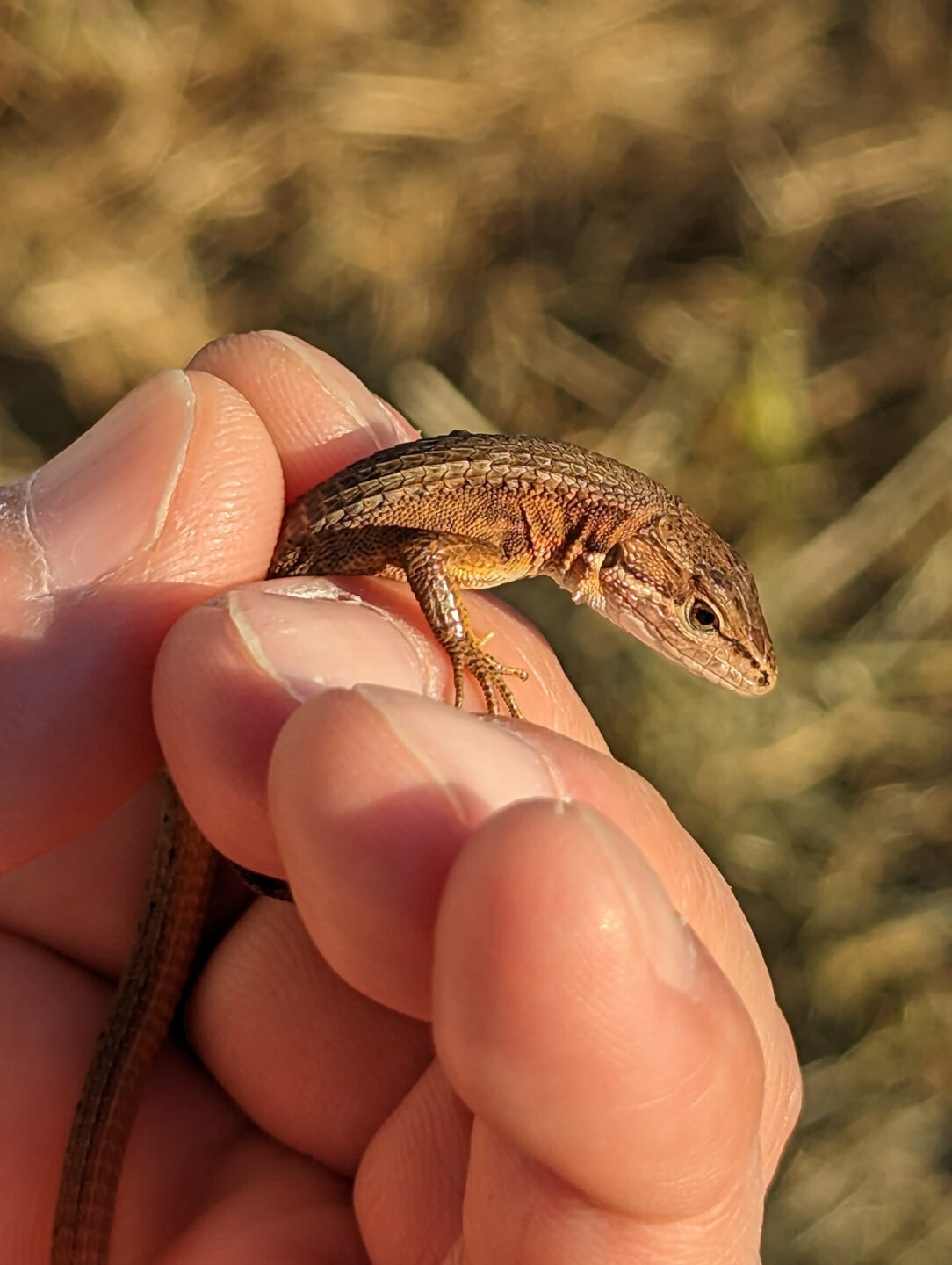 多摩川をブラブラと散策中にカナヘビを見つけたので捕まえて撮ってみました。マクロモードではなく2倍の望遠カメラなのですが、小さな恐竜のような肌の様子をリアルに撮影できました。背景ボケの感じも好印象です。