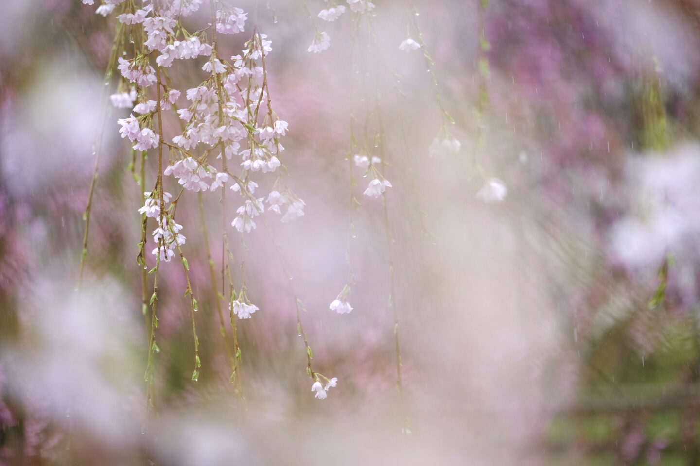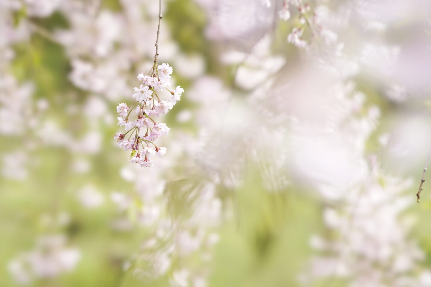 垂れ桜の雰囲気は垂れている枝ですね。その雰囲気を出すなら、手前の枝越しに向こう側の垂れているものにピントを合わせてみましょう。離れて小さくなるだけでなく、手前の枝が前ボケになるのでたくさん咲いている雰囲気を出すこともできます。このとき、枝先を切ってしまうとごちゃごちゃした印象になりやすいので、枝先を入れるだけでなく少し空間を作るとすっきりとした印象に仕上がります。