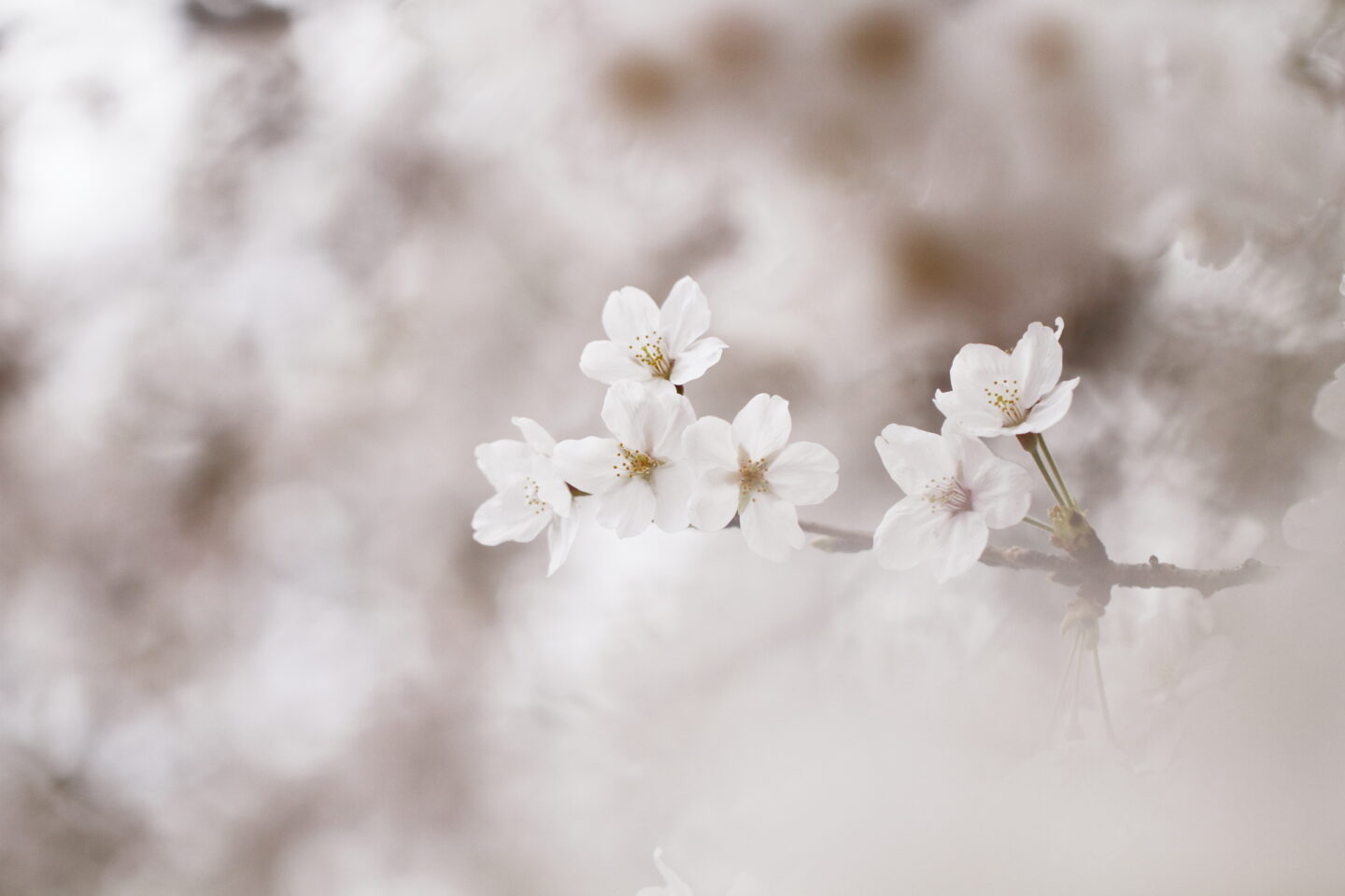 曇天の空の下では、グレーな空が真っ白になるまで極端なプラス補正をします。それが好みだからです。木の幹を背にした方向から手前の花を前ボケに置いて枝をフレーミングしています。手前の花と奥の花の距離は1mくらいです。