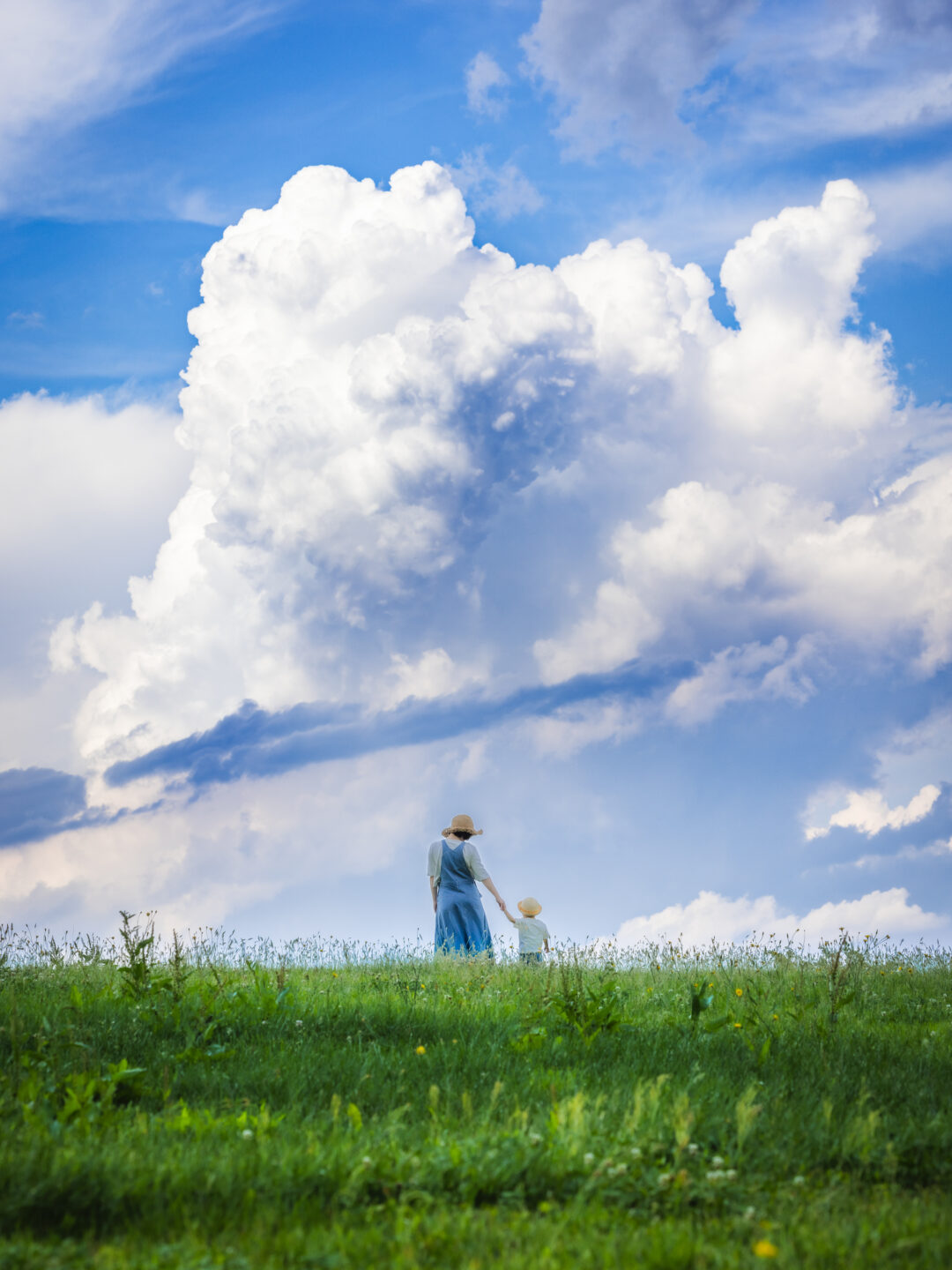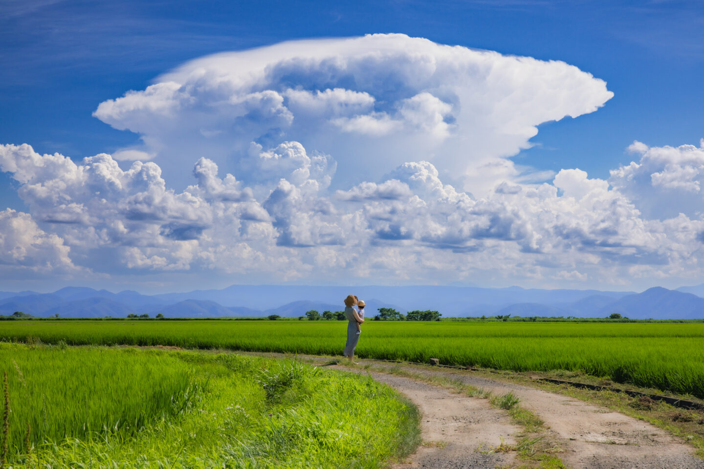 また、下の青空の写真では家族が遠くの山を眺めている事で自然と『全体の風景→家族→山』といった流れで視線を誘導することができ、作品に奥行きを生み出す事が出来ます。