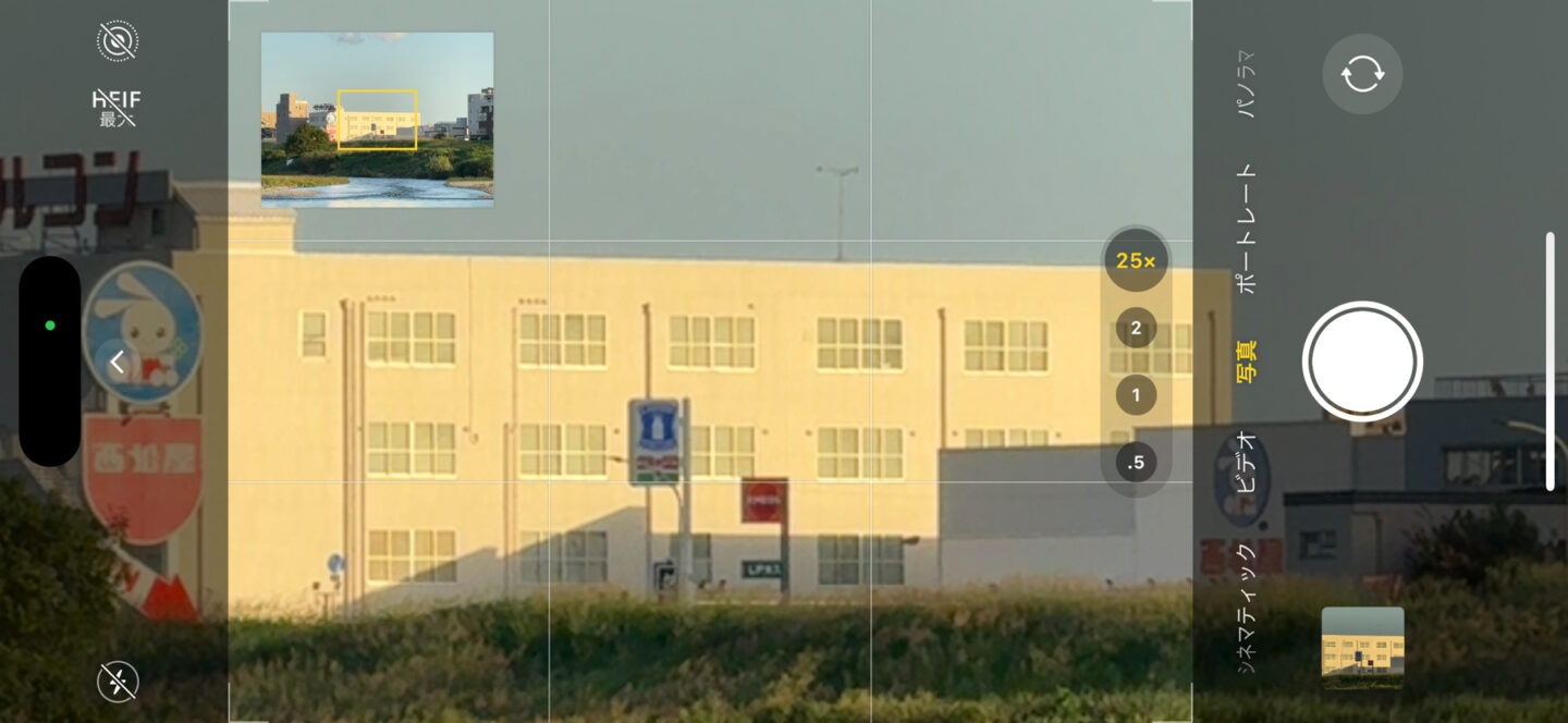 望遠撮影時(8x以上)にはこのように小さなウィンドウが画面内に表示されて被写体を捉えやすくなっています。また設定で水準器も表示することも可能になりました。水平時には微弱ですが触覚フィードバックが伝わってきますよ。