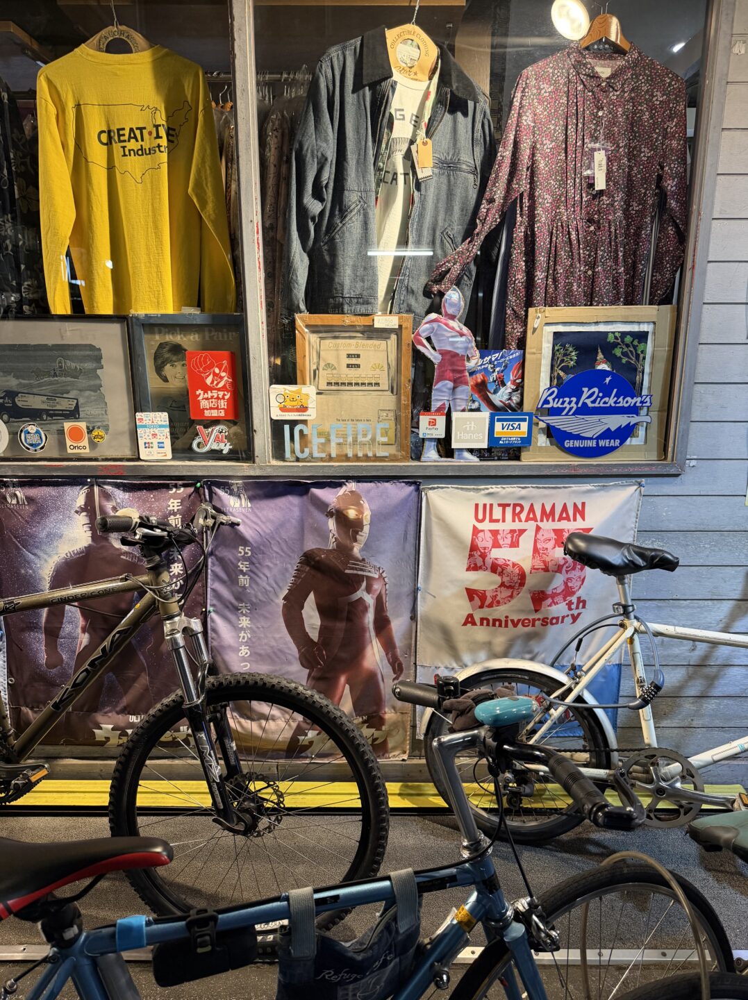 夜の商店街。さまざまなタイプの光源がミックスした環境でしたが、自然な印象の写真に仕上がりました。ショーウィンドウ内の洋服や停められた自転車のディテールも見事ですね。