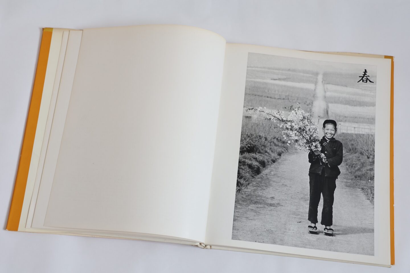 冒頭、「春」の章を開くと、一本道の真ん中で桜の枝を抱えて立つ、イガグリ頭で満面笑顔の少年がいる。強く印象的な縦位置のポートレイトである。続いて横位置で写された、横に広がる白い一本道の写真へと変わり、さらにページをめくると向こうからボールを手にした制服姿の少女がしだいに近づいてくる。その縦と横、さらに奥行きをもったイメージの連なりはじつに映像的だ。後に続く写真も近在の子どもたちを呼び止めて撮られている。その単純化された画面はまさに「植田調」だ。