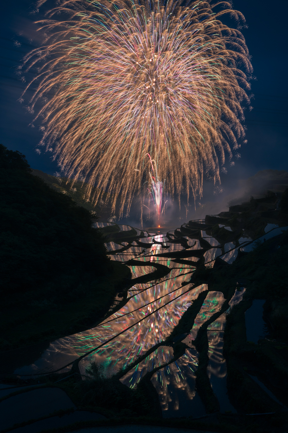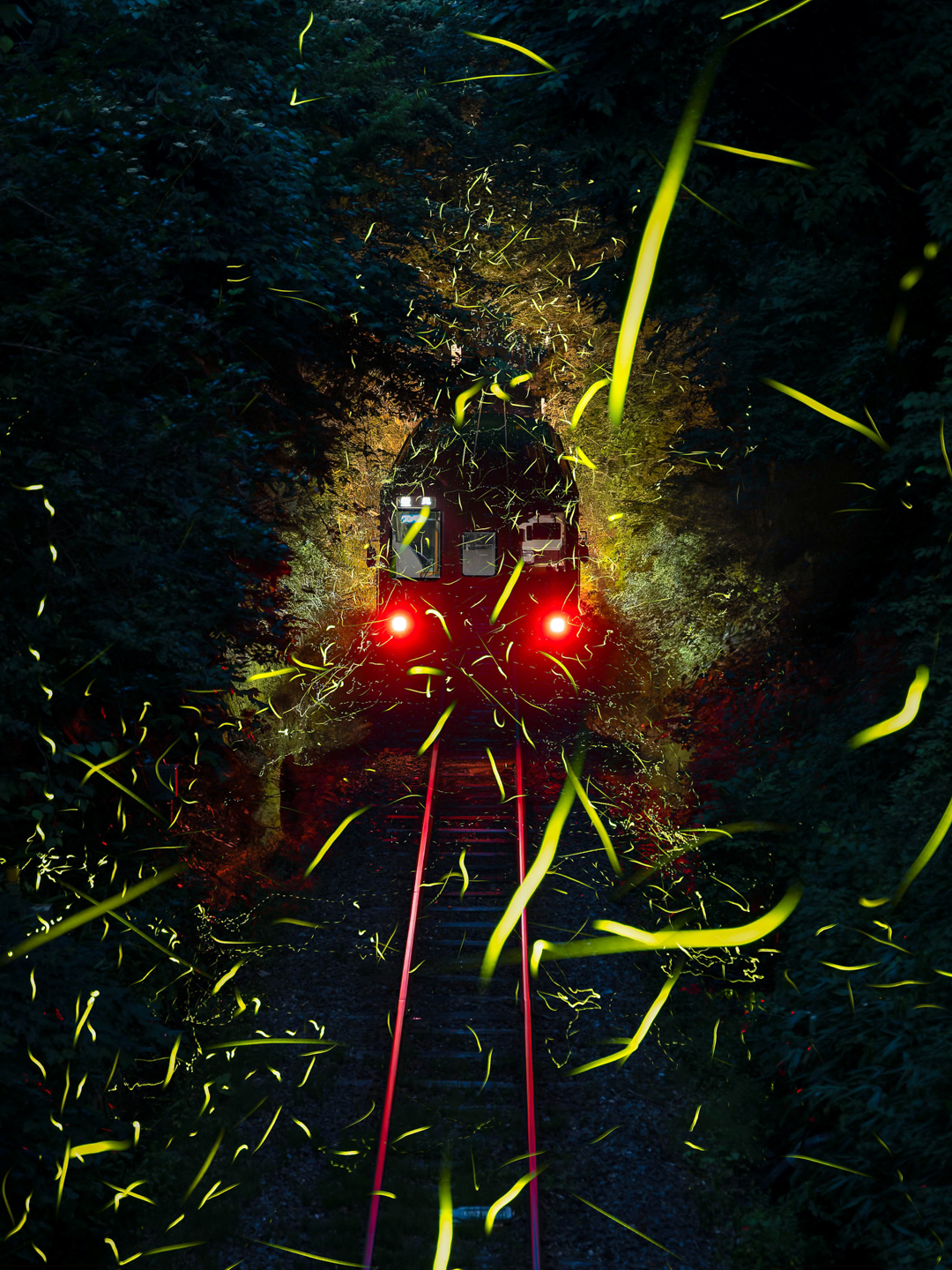 タイトル「銀河鉄道」にふさわしく、見る者を物語の世界へと誘うようなロマンと神秘性に満ちています。現実の風景を超え、光によって新しい世界を創り出した表現力の高さは見事です。時間と空間を超えるような壮大なスケール感と静かな感動を併せ持つ作品です。一目見たときに心惹かれました。闇の中に浮かび上がる車体、赤い尾灯が印象的に輝き、画面手前に伸びるレールも赤く光る様子は、それだけでも美しいですが、さらに蛍の乱舞の光が画面を彩っています。蛍の光のラインは長時間露光、電車はピッタリ止めるという相反する表現ですが、多重露出で見事に映像化しています。想像力とテクニック、両方が光る作品です。