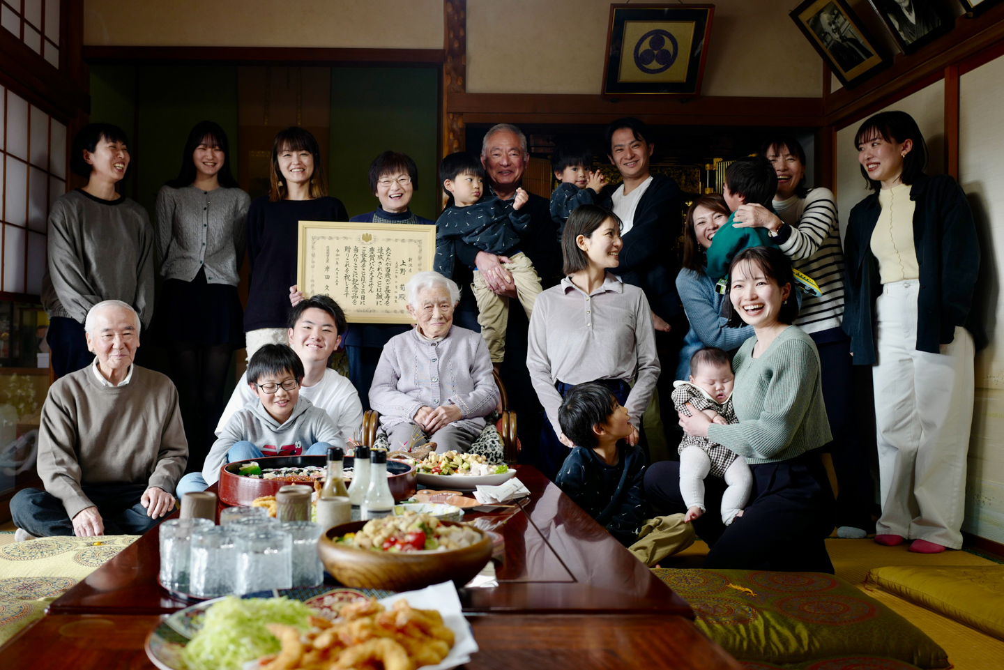 親族が一堂に会し、100歳を迎えたおばあさまを囲むこの写真は、まさに「命のつながり」を感じさせる温かな作品です。全員の顔が必ずしもカメラを向いていないにもかかわらず、お祝いの賑やかさや家族の一体感が見事に伝わってきます。中央で微笑むおばあさまの穏やかな表情が写真全体の中心となり、長い年月の重みと、これからも続く命の温もりを象徴しています。和室の温かな空間に食卓の彩りが加わり、特別な演出ではなく、ありのままの「日常の延長」にある祝いの場を丁寧に捉えた、心に残る一枚です。