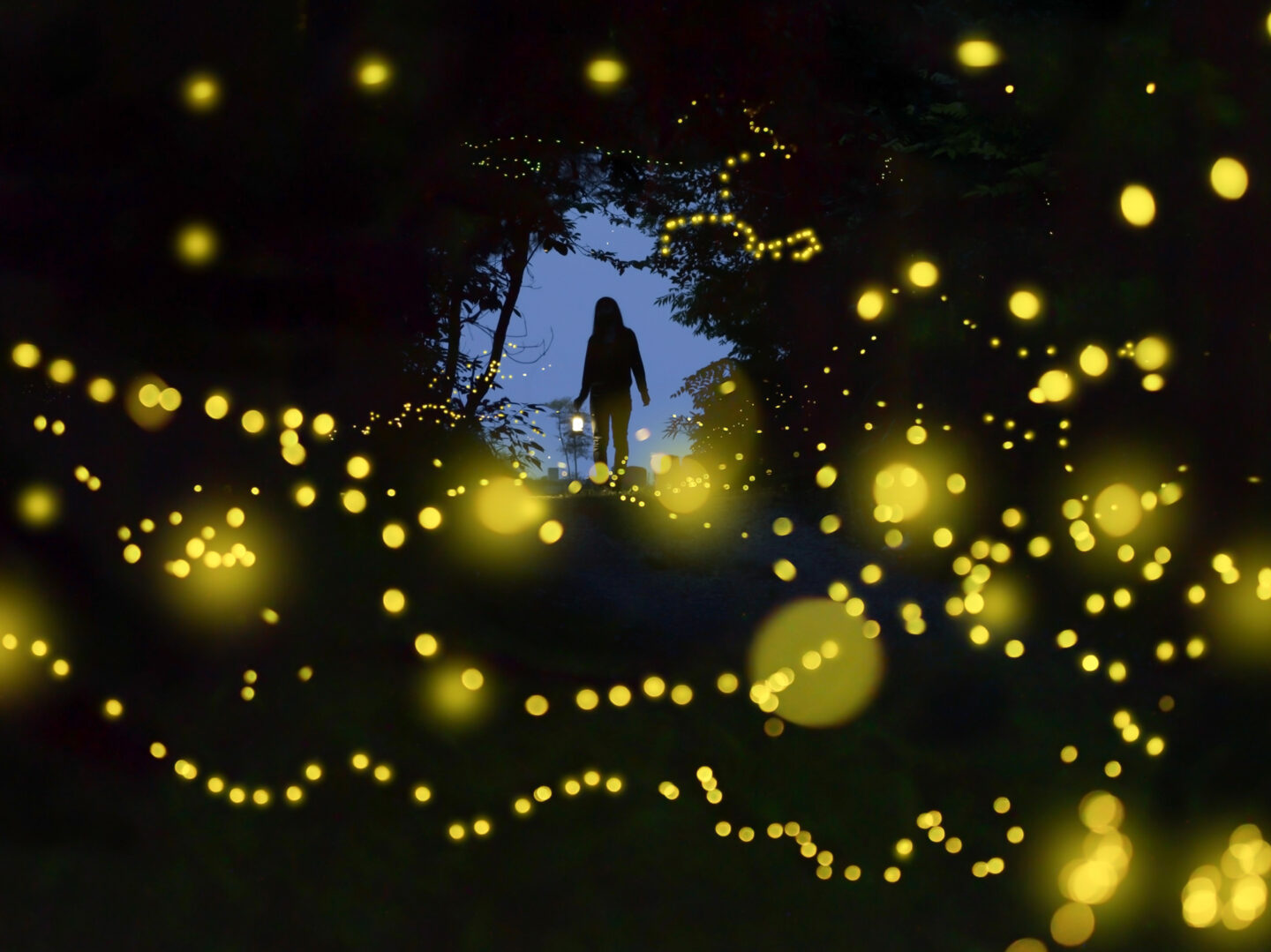 蛍の光を際立たせるには、ある程度暗い背景が必要です。背景だけでみても、人物を小さく入れながら森に入ってくような素敵な写真で、そこに蛍の光が小さく、大きく、沢山ボケているのが夢のようです。