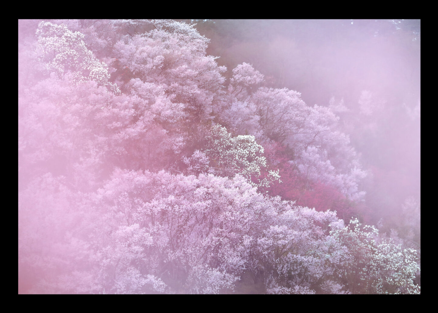 桜色のかすみに包まれて、空気が優しく柔らか香っているようです。フィルターを使ったのかな?と思いましたが、ベニシダレ桜の前ボケのふんわり感だったようです。前ボケに濃淡があるのも可愛らしいですね。曇りの日は花を柔らかく表現できるものの、色がくすみやすいのですが、前ボケも含めて綺麗に色が出る露出が絶妙です。桜のグラデーションと木蓮の陰影が美しく、ここに行ってみたいなと思わせる作品だと思います。プリントがとても美しかったです。