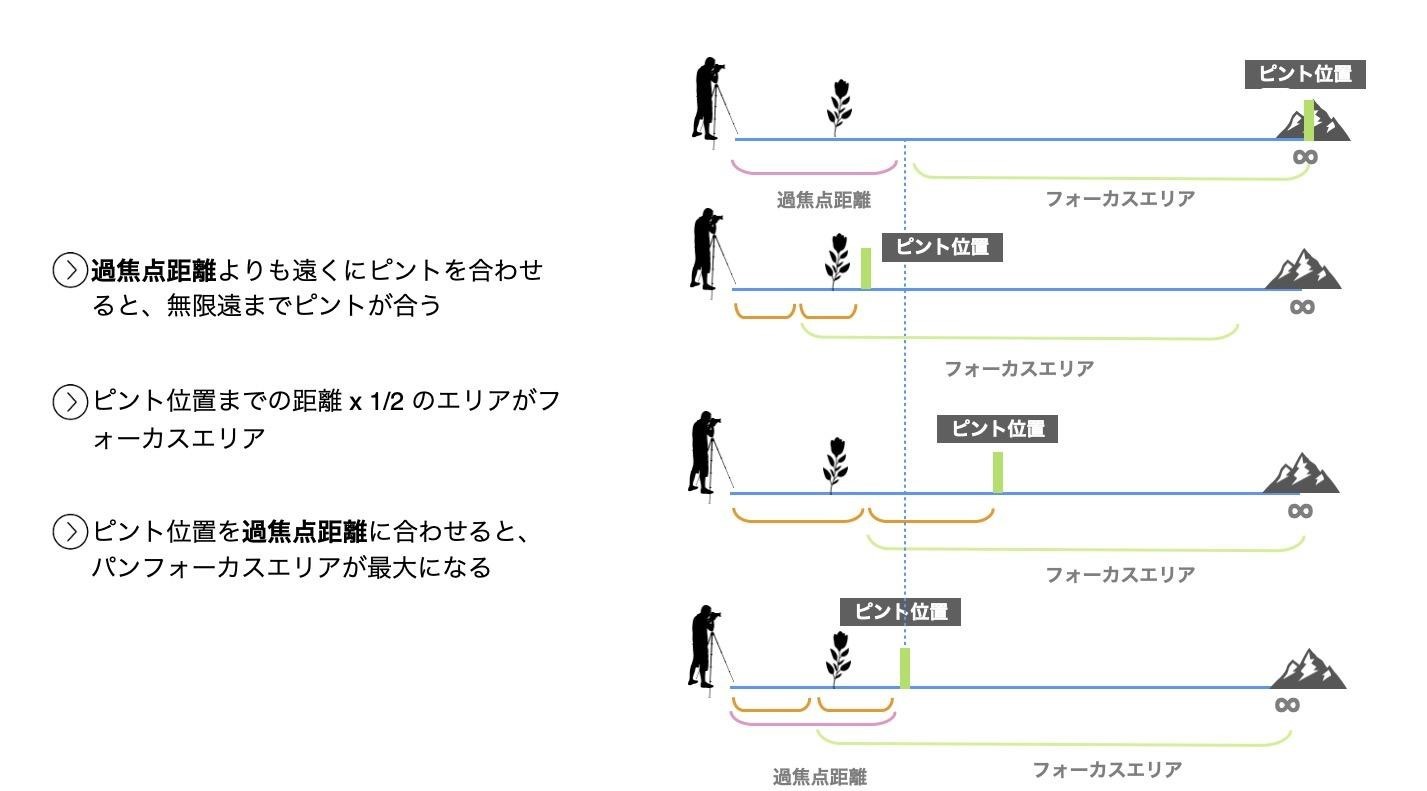 ここで過焦点距離という難しい言葉が出てきますが、過焦点距離というのは焦点距離と絞りから求められる値(後述)になります。