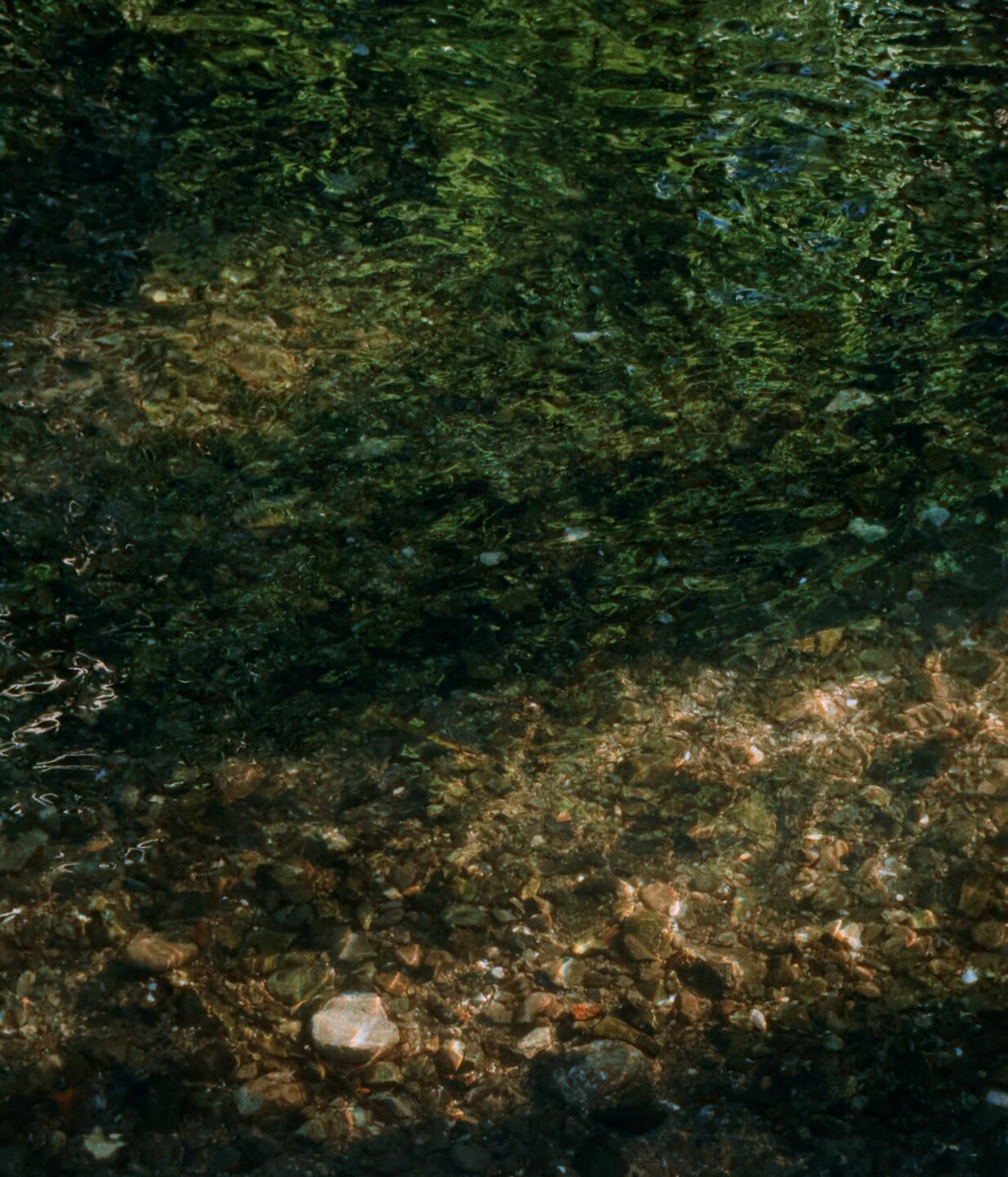 照らされる水底と緑の反射。