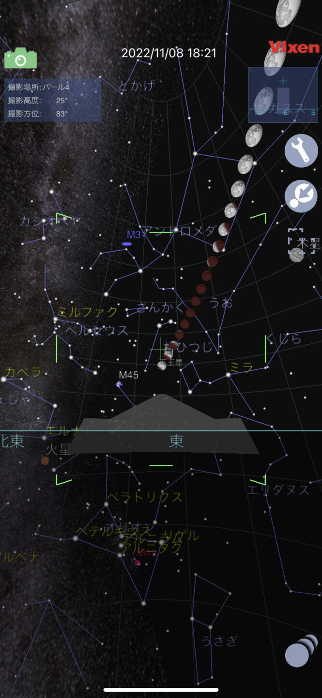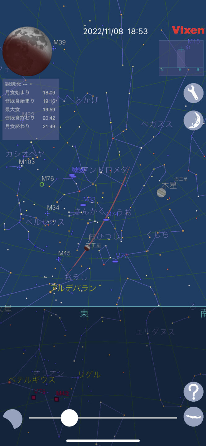 このアプリは月に関する情報が満載のアプリで、皆既月食の情報も手軽に入手することができます。Moon Bookによると、皆既月食のはじまり(月が完全に地球の影に隠され赤くなる)は、19:16。このときの高度がおおよそ30度。また、皆既月食の終わりが20:42で高度おおよそ47度です。方角はほぼ真東の方角になります。