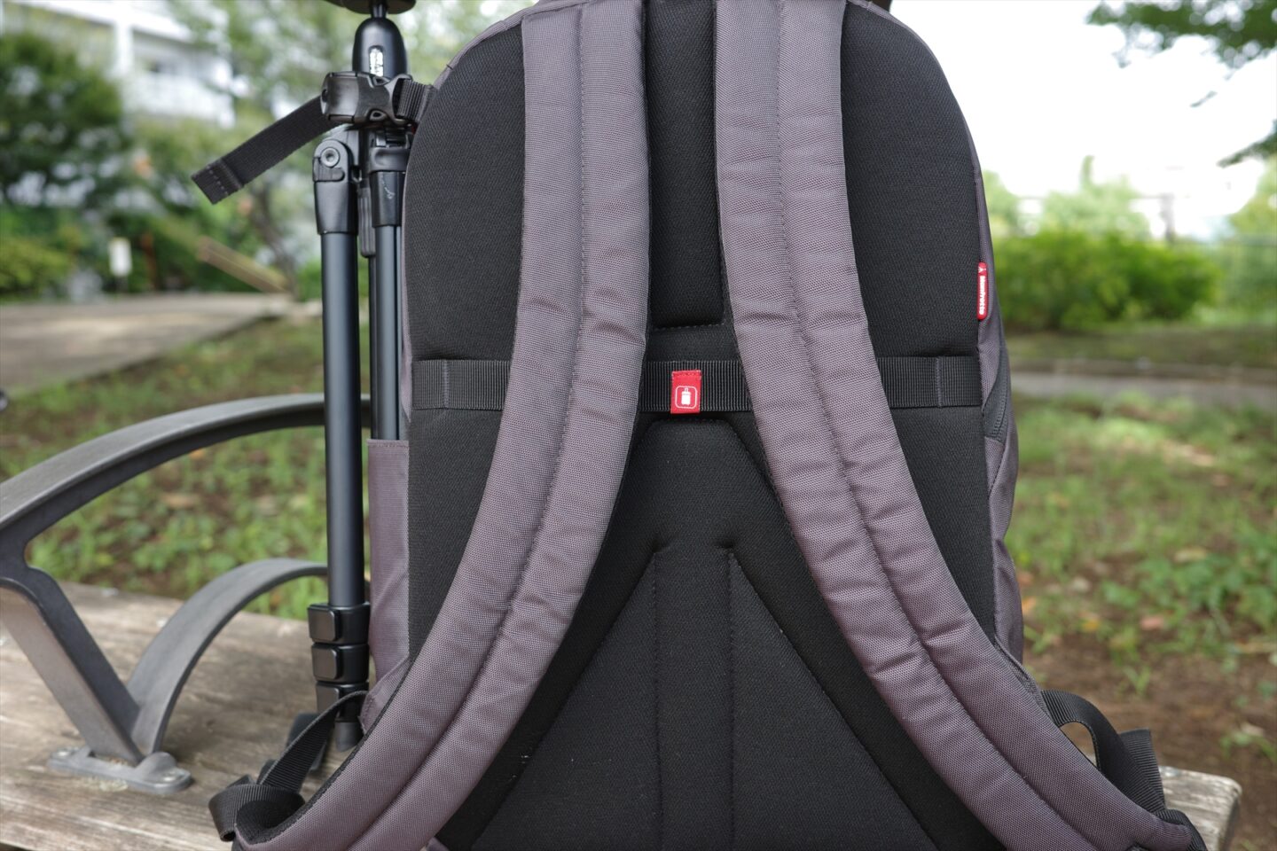 ショルダーハーネスはとてもシンプル。リュック自体が身体の大きな男性向けという感じなので、チェストストラップがあるとさらに良かった。背面パネルはロゴマークの形にクッションパッドが入っていて、ソフトな当たり心地です。キャリーケースの上に乗せて運ぶための横ストラップもついています。