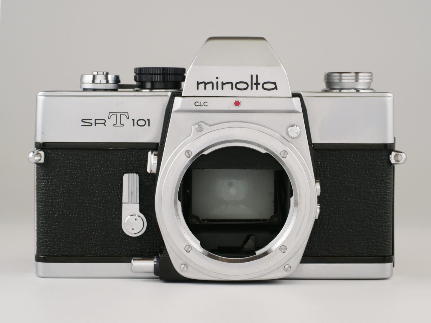 ミノルタSR-T101は、1966年に発売開始された35ミリ判のレンズ交換式一眼レフです。直線基調でデザインされた四角いボディと大ぶりなペンタプリズムカバーから受ける印象から“マッコウクジラ”とこのカメラを呼ぶ人もいました。オーソドックスな4軸機械式の横走り布幕フォーカルプレーンシャッターは1/1000秒から1秒で作動し、シャッターボタンと同軸に設けられたフィルム巻き上げレバーは小刻み操作も可能。セルフタイマーと絞込みレバー、ミラーアップ機構も内蔵された実用に充分な仕様を持つカメラでした。