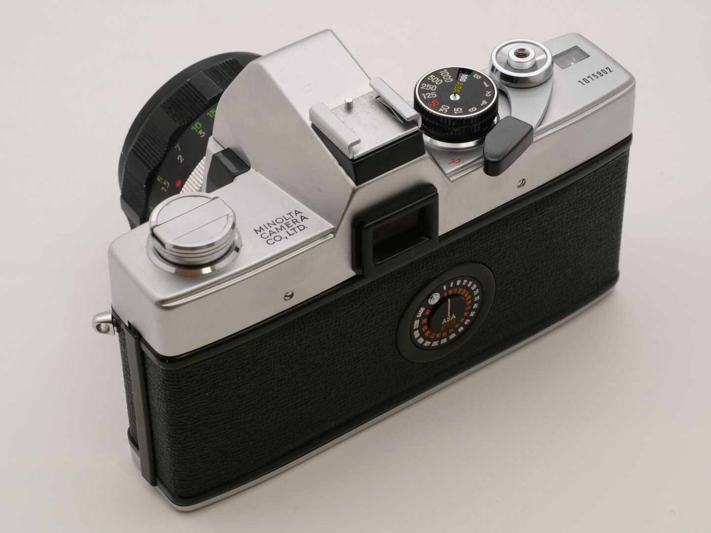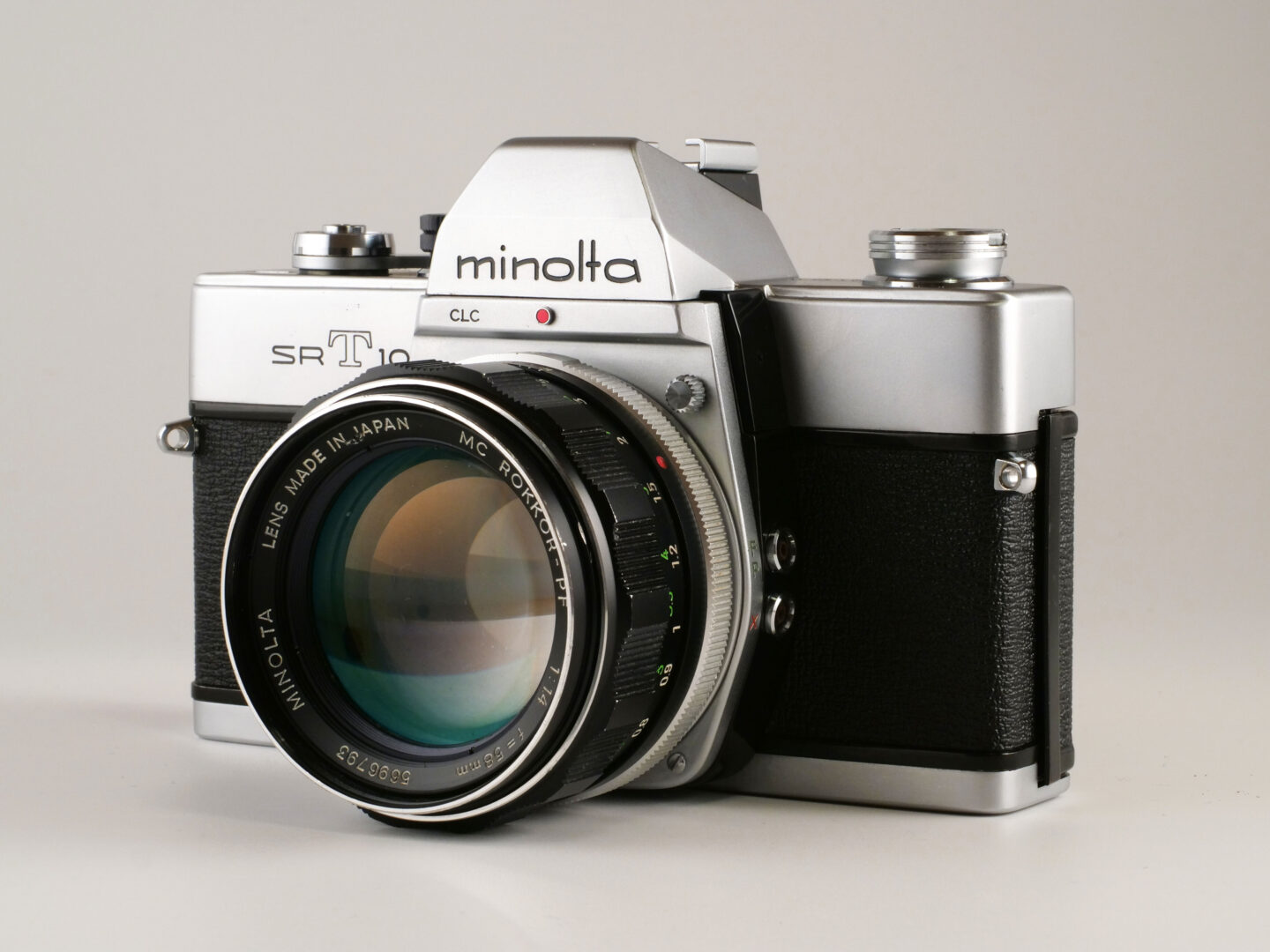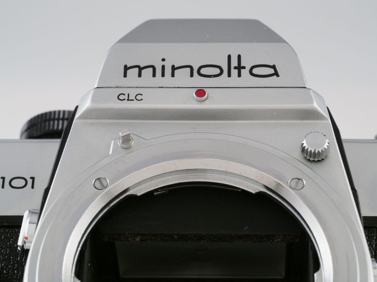 この当時のミノルタのロゴは小文字です。その後のCI(コーポレート・アイデンティティ)ブームに煽られて変更した大文字のロゴよりも清楚な印象ですね。そのロゴの左下にCLCとあるのは、ミノルタ独自のコントラスト・ライト・コンペンセーターと呼ばれる測光システムを表しています。それはカメラを横位置に構えた際に画面の上半分(主に空・明るい部分)と下半分(地面や被写体など・暗い部分)の2箇所を測り、その平均値を算出するという分割測光の先駆けとなる方式です。このことからCds(硫化カドミウム)受光素子がペンタプリズムの稜線に沿って上下にレイアウトされているのでプリズムカバーが上に伸びて“マッコウクジラ”みたいな雰囲気を醸し出しているのです。ちなみに他社の一眼レフではペンタプリズムがアイピースと接する断面の左右に受光素子を置くのが定石でした。