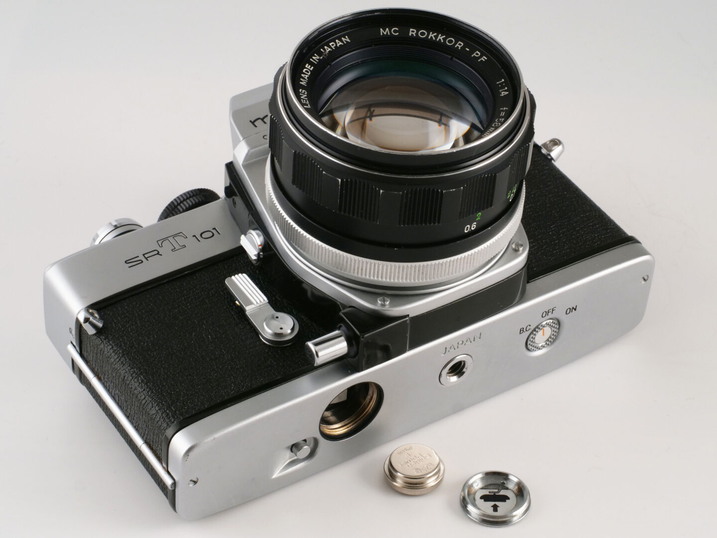 このカメラは機械式のシャッターなので作動させるのに特に電源は必要ありません。露出計にはMR-9型の水銀電池を使用します。1990年代に環境負荷への配慮ということで(それまでのことは特に触れないままで)水銀電池は販売が中止されたので、現在では同等のサイズで電圧が少し高いアルカリボタン電池を代用品とすればメーターを動かすことが可能です。ファインダーの視界右サイドにはシャッターダイヤルおよび絞りリングと機械的に連動する腕木があり、その先端の丸印を光に応じて動く指針に合わせることで適正露出となります。視界下端にはシャッター速度を示すスケールも用意されていて使い勝手は上々です。