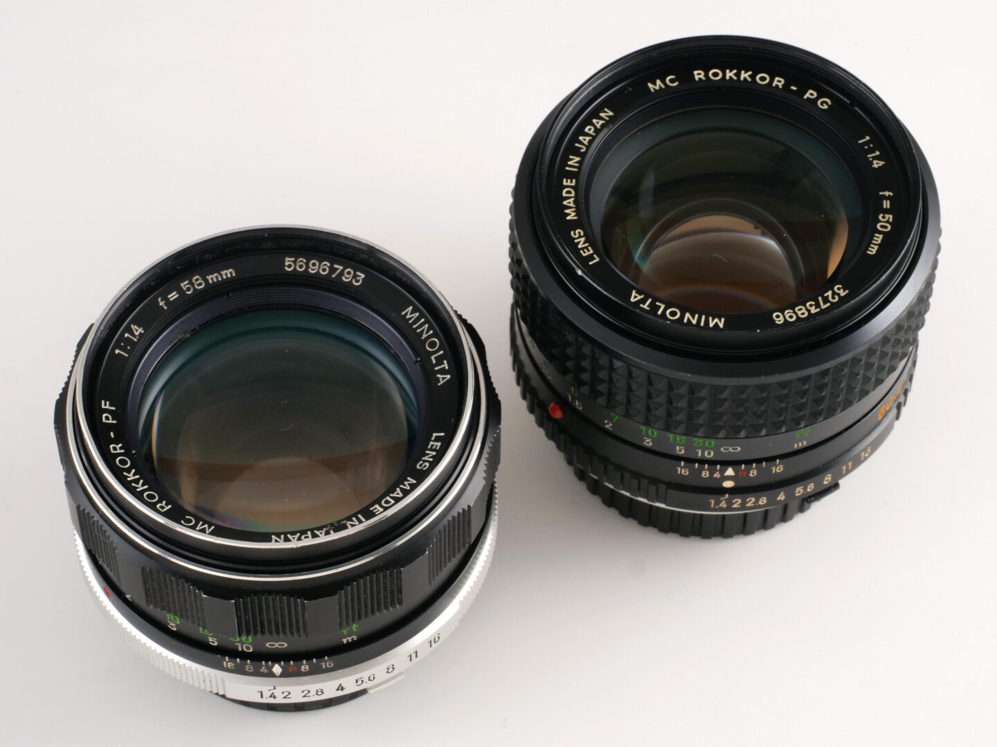 ミノルタSR-T101の発売と同時に、開放測光に対応するための連動機構を搭載したMCロッコール交換レンズがリリースされました。それ以前のレンズとバヨネットは同一です。ミノルタのMFシステムはMCロッコールの後には絞り優先・シャッター優先およびプログラムAEを搭載したミノルタXDに対応すべく、絞りの動特性を向上させたMDロッコールへと進化していきます。ちなみにMCロッコールには大きく2世代があり、ピントリングがローレット加工の金属製でエッジが銀色の前期型と、ピントリングに合成ゴムのブロックパターンが巻かれた真っ黒い後期型が存在します。