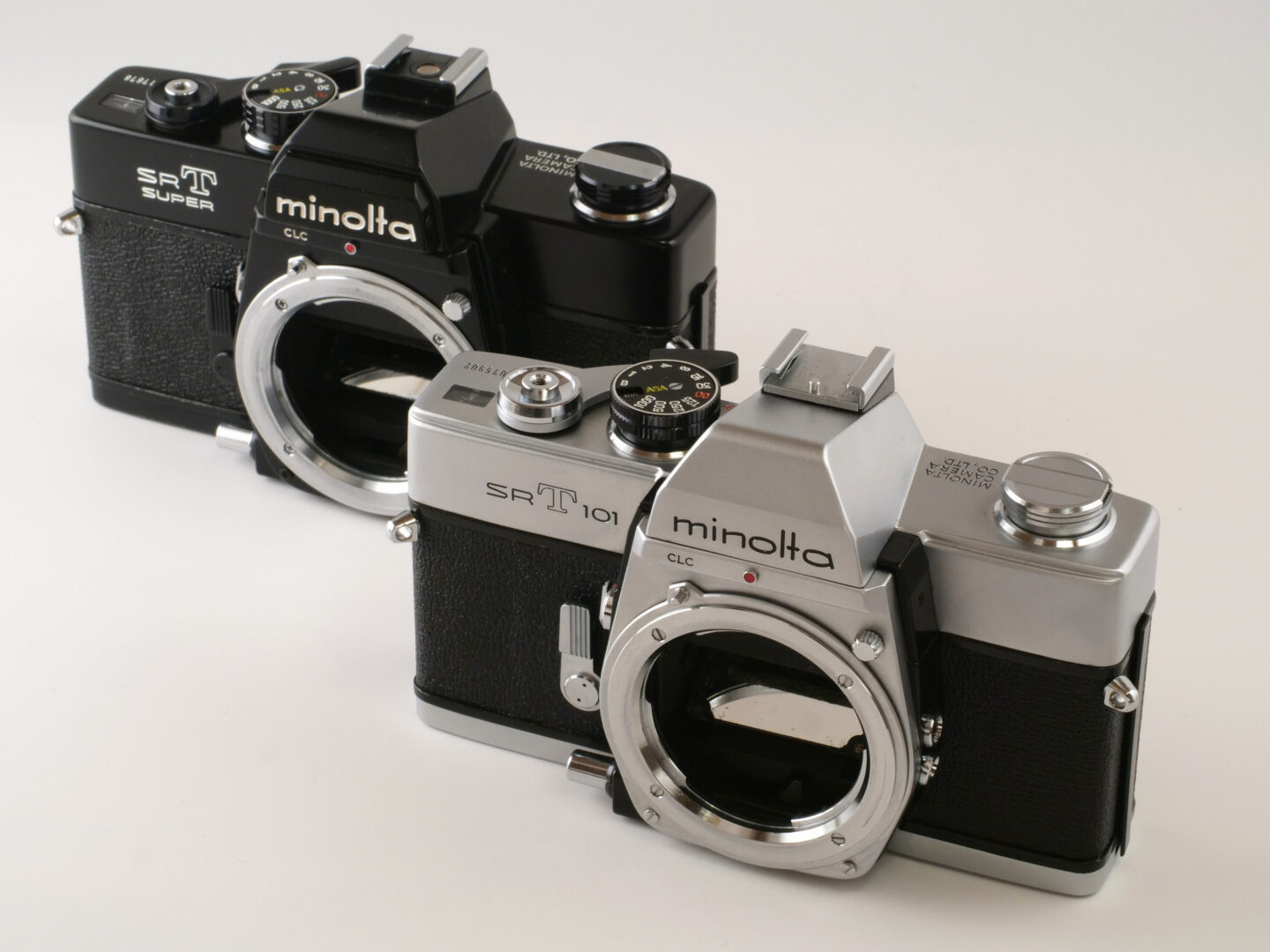 ちなみに後期型のMCロッコールと時代的にマッチするのは、1973年に発売開始されたSR-T101のバージョンアップモデルにあたるSR-Tスーパーです。写真左の黒いボディがSR-Tスーパーで、主な改良点としてはシンクロケーブルを用いなくてもアクセサリーシューにフラッシュを装着するだけで発光させられるホットシューの接点が設けられたことやファインダースクリーンが改良されたことに加え、ファインダー内で絞り値が直読できるようになったこと。この光路を確保すべくプリズムカバーが前に迫り出してきたので“マッコウクジラ”感がマシマシになっています。7年かけてあまり進化していないように見えますが、これはSR-T101の基本仕様がしっかりしていたことの証とも言えます。大きな違いとしては使用されるネジがマイナスからプラスになり、組み立ての効率化が進んでいることぐらいです。