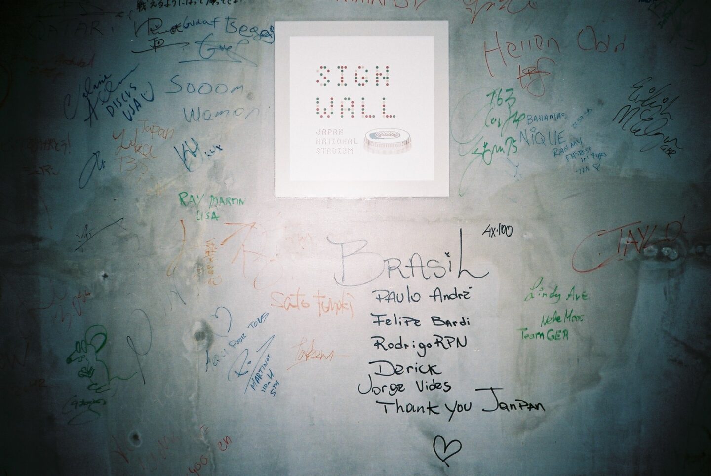 国立競技場内の更衣室などがあるバックヤードには、フィールドで競技を争った各国の選手のサインが多数書かれているのを見る事ができます。