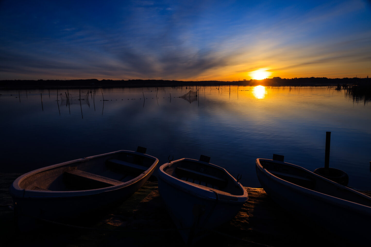 輝度差の大きな難しい状況ながらしっかりとしたテクニックで、素晴らしい朝日の作品に仕上げています。広角24mmレンズで手前の船を大きく取り入れた三分割構図で主題と遠近感を強調。四隅まで隙の無い画面構成です。