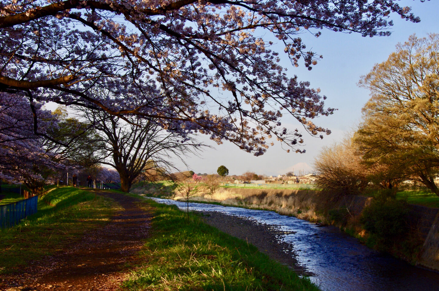 覆いかぶさる桜を手前に大きく取り入れ、道と川、2本の曲線を無駄なく配置することで遠近感が上手く表現されています。借景的に扱った富士山と桜の枝先が被ることが無いよう良い高さにカメラを構えられています。