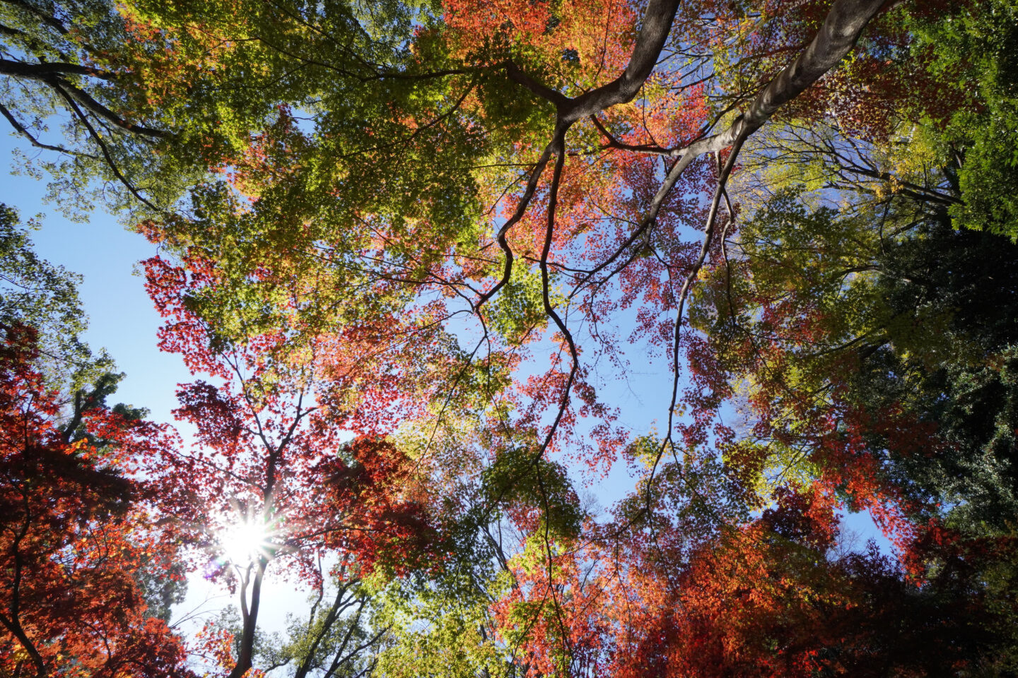 ほぼ真上を向き、超広角レンズで木々が伸びあがる様子をダイナミックに描いています。このようなシーンでは画面が散漫になりがちなのですが、画面上部から下に向けての枝ぶりがポイントとなり画面を引き締めています。色変わり中の紅葉を逆光で捉え、キラキラとした色表現になりました。