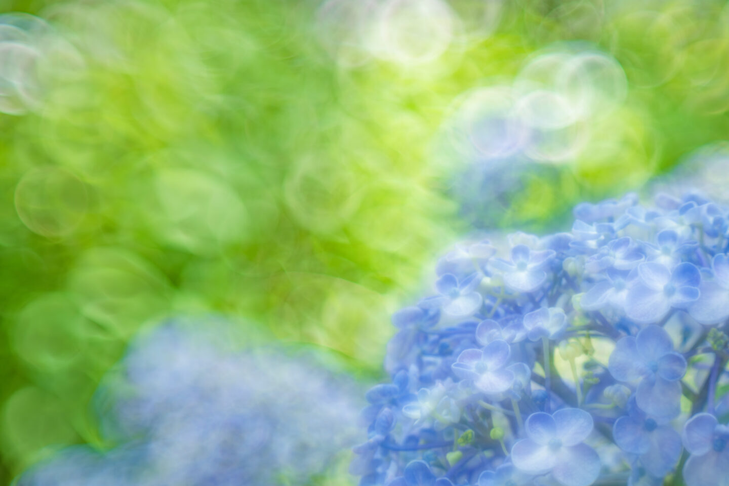 実際に下の花の写真の背景は紫陽花で、水色の部分が紫陽花の花、緑の部分が葉で、お昼時の高い場所からの太陽光があたっている状態で撮影をしたものになります。ミラーレス機で撮影すればバブルボケの発生状況はリアルに確認できるので、それほど撮影は難しくありません。
