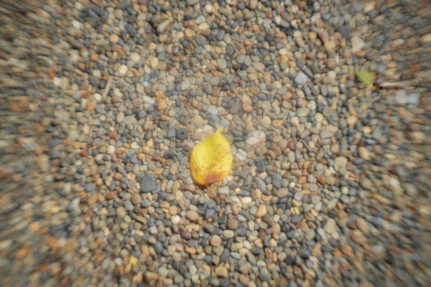 実際に分かりやすくするために、足元の落ち葉を中心にして撮影をしてみました。周辺は大きく流れているのがよく分かると思います。レンズの後玉の方向を入れ替えたことにより、周辺の像を結像できなくなった事による描写になります。