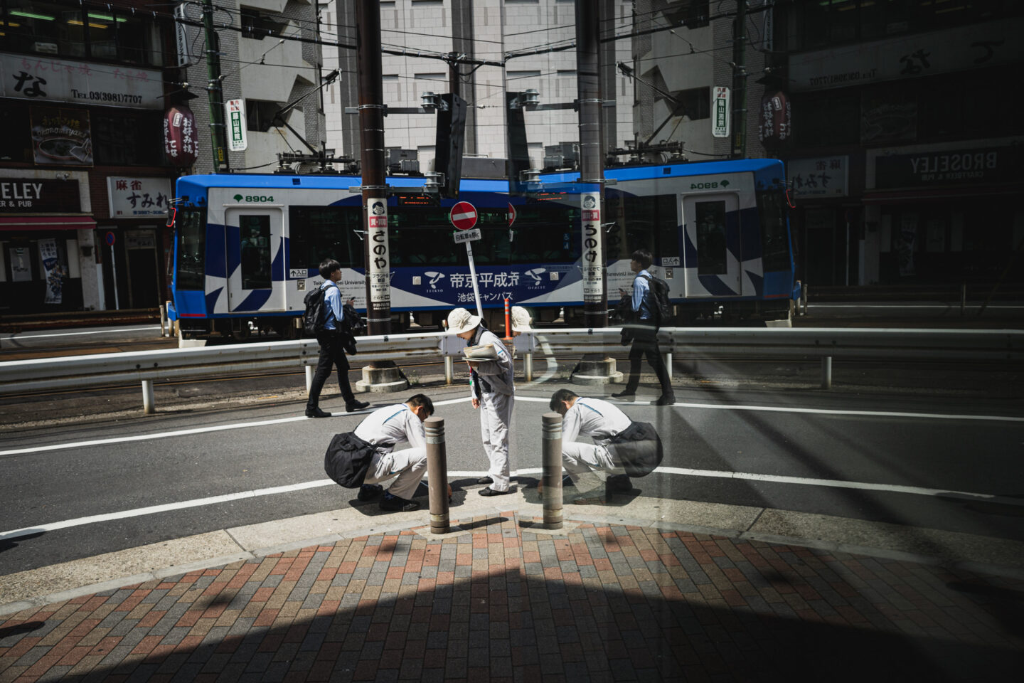 古いビルのドアは両面開きのガラスの事が多い。開いた状態だとガラスに余計な枠が映り込まないので、この様に綺麗な反射を狙うことができる。この場所では都電と往来する人の反射が撮れたらいいなと待っていたところ、路面を計測している人たちが。制服を着て働く人ってスナップを撮るときに意図して狙って撮ることが多いのだが、この様に実際働いている動作をしているときはさらに絵になる。そこを反射で捉えたらさらに作品性がアップした。
