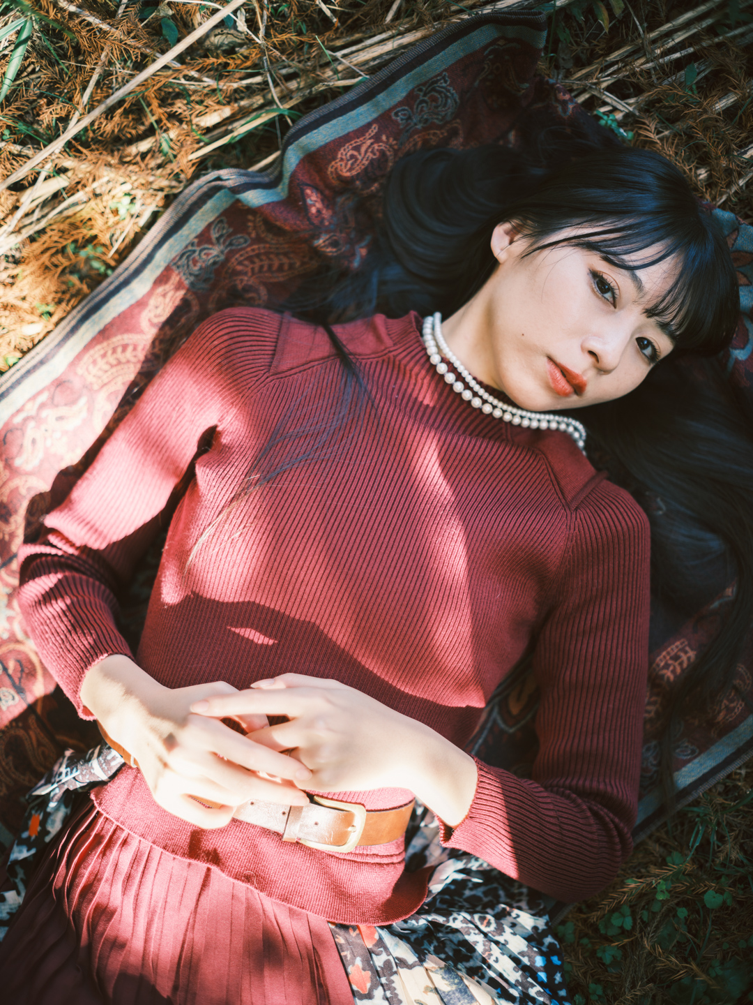 モデルに直接光を当てたやや難しい順光下でのポートレートです。秋の光は柔らかくコントラストがつきにくいため直接顔に光を当ててもコントロールしやすい特徴があります。