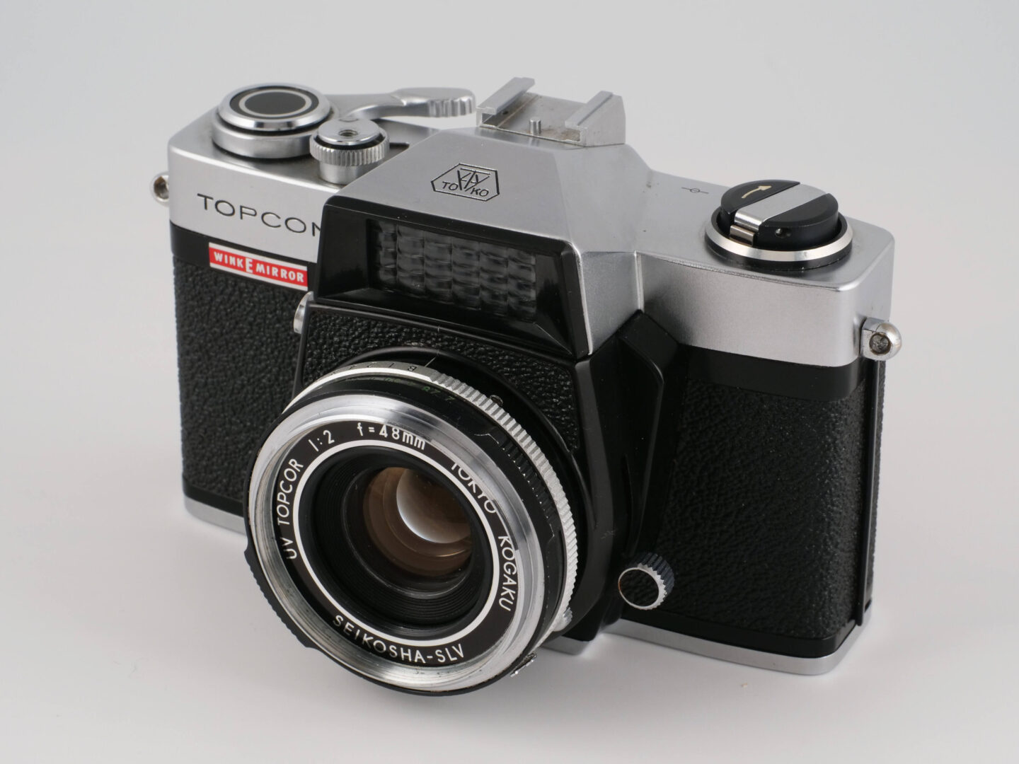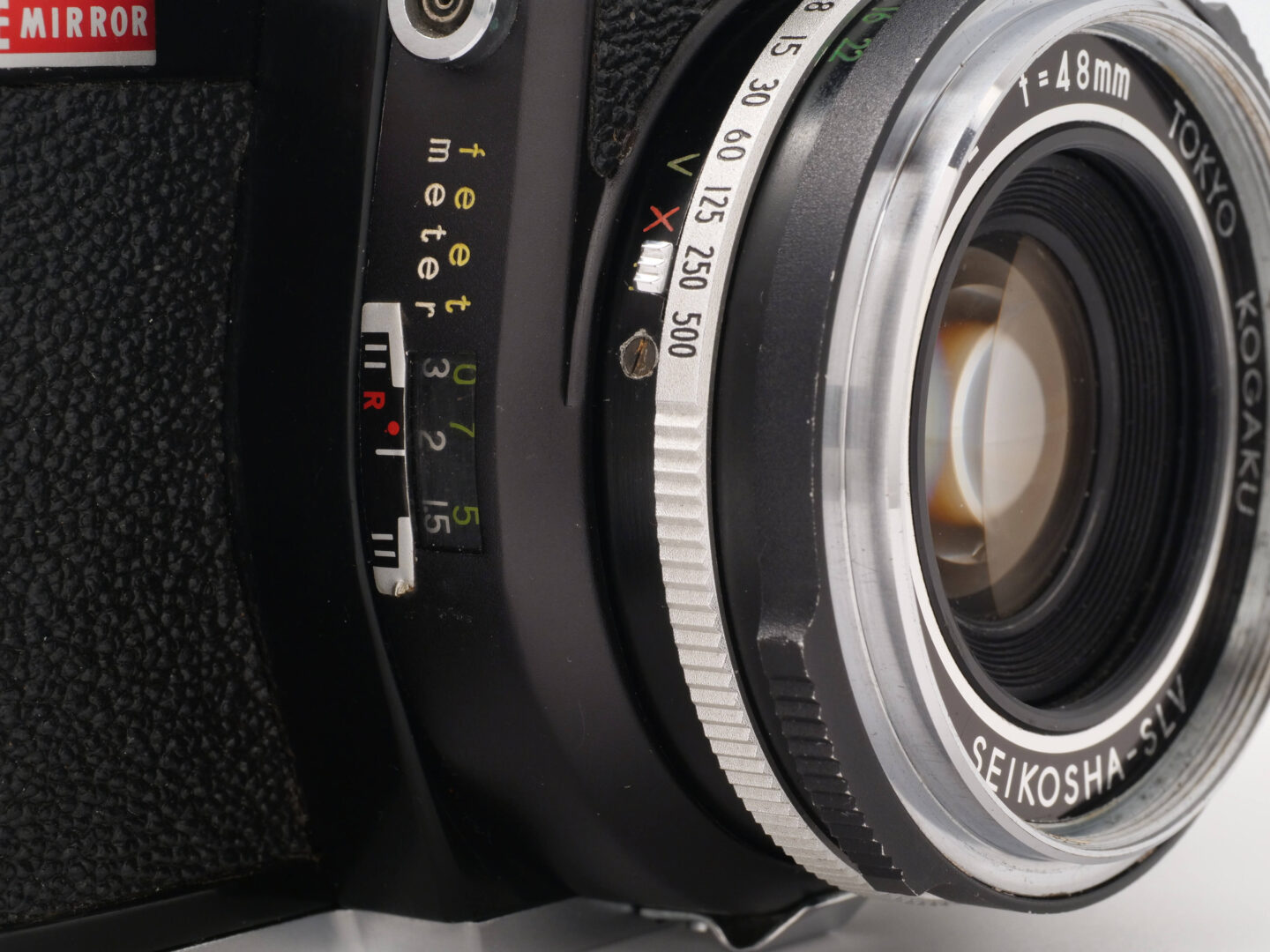 このカメラ、ボディの肩にWINK E MIRRORという赤いバッジが貼ってあるのでトプコン ウインクEミラーと表記されることもありますが、正しくはトプコン ウインクミラーEです。Eは正面についたセレン光電池による外交式の露出計を内蔵していることを示しているようです。ファインダー内で指針を合わせる露出決定は操作性もよく、スプリットイメージによるピント合わせの正確さもあり、意外に使い勝手の良いカメラです。本機のレンズは48mm F2のUVトプコール。レンズは固定式で先端にねじ込むワイド・テレコンバージョンレンズが用意されていたようですが、今となっては探すのも難しいので潔く標準レンズの画角で撮影を楽しむ方がハッピーになれると思います。